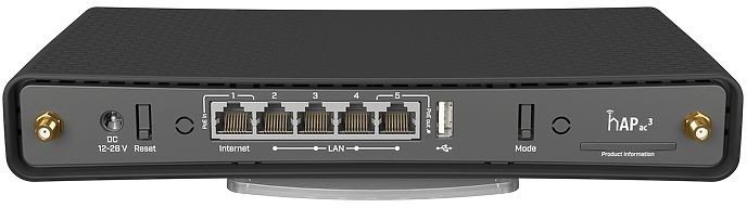 hAP ac³ A wireless dual-band router with 5 Gigabit Ethernet ports and external high gain antennas for more coverage Forget about endless searching for the perfect router and scrolling through an eternity of reviews and specifications! We have created a single affordable home access point that has all the features you might need for years to come. Is your old router struggling to reach every corner of your home? Well, forget about that! We have included external high gain wireless antennas with outstanding coverage. Only strong and stable wireless connection in every room from now on! With 5 Gigabit Ethernet ports, 256 MB of RAM and quad-core CPU, hAP ac³ can satisfy even the biggest and most demanding households. With PoE support, it can power or be powered by other devices. There is a 128 MB NAND and a full-size USB port that you can use to add extra storage. The new enclosure allows mounting the device vertically or horizontally. A wall mount set is also included.