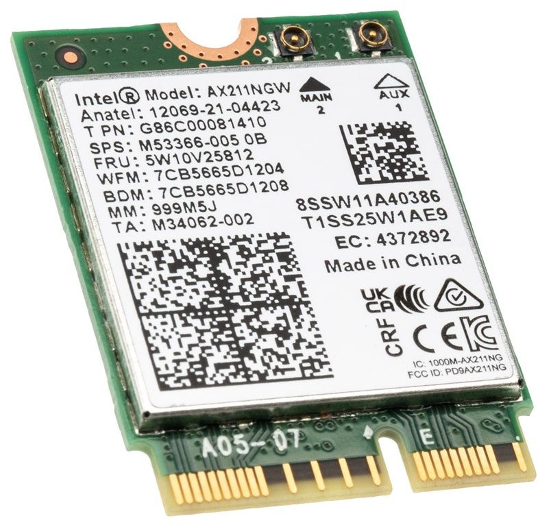 The Intel Wi-Fi 6 AX211 is a WLAN and Bluetooth 5.3 adapter in the form of an M.2 2230 module with an E-Key. The adapter is simply plugged into a free M.2 slot, thus expanding any laptop or PC with fast WLAN and Bluetooth. The built-in Intel AX211 chipset allows transmission in the 2.4, 5, and 6 GHz range and supports the 802.11ax standard. Transmission speeds of up to 2.402 Gb/s can be achieved. In addition to 2x2 MU-MIMO, the Wi-Fi 6 AX211 also supports OFDMA (Orthogonal Frequency-Division Multiple Access) and Intel vPro. The Intel Wi-Fi 6 AX211 module is also backward compatible with many common WLAN standards: IEEE 802.11 a/b/g/n/ac/ax. Current encryption techniques such as WPA/WPA2/WPA3 ensure high security.