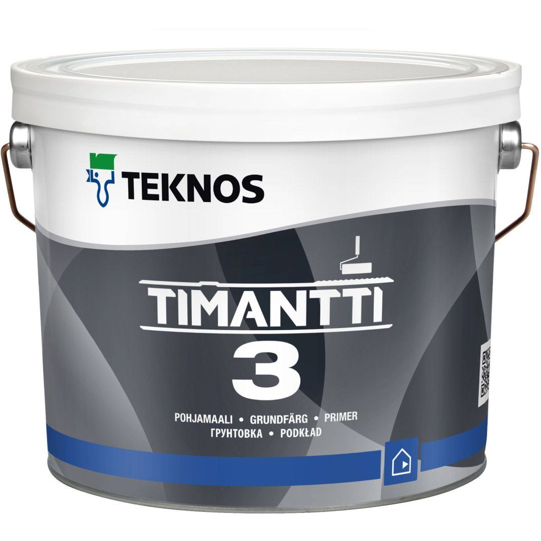 Teknos Timantti 3 on täismatt vesialuseline valge kruntvärv seintele ja lagedele sisetingimustes. Värv on hallituskindel ning kuulub ehitusmaterjalide emissiooniklassifikatsiooni M1-rühma.<br /><br />Timantti 3 sobib eelnevalt värvimata betoon-, krohv-, pahtel-, tellis- ja ehitusplaatpindade kruntimiseks. Saab kasutada seintel ja lagedel nakkekrundina eelnevalt alküüd- ja dispersioonvärvidega kaetud pindadel.<br />Samuti tapeeditavate pindade kruntimiseks. Lisaks sobib Timantti 3 ka galvaniseeritud metallpindadele, nt. ventilatsioonitorud.<br /><br />• Katvus: 4-8 m²/l sõltuvalt pinna imavusest<br />• Kuivamisaeg (+ 23°C; RH 50%): tolmukuiv 0,5 h pärast, ülevärvitav 1 h möödudes, valmis tapeetimiseks 24 h<br />• Vedeldi: vesi<br />• Töövahendid: pintsel, rull, pihusti (soovitatav düüsi suurus: 0,017-0,021")<br />• Toon: valge<br />• Värvimistingimused: õhu- ja pinnatemperatuur vähemalt +5°C, suhteline õhuniiskus alla 80%. <br />• Pesu- ja kulumiskindlus: märghõõrdeklass 2 vastavalt EN 13300 (ISO 11998)