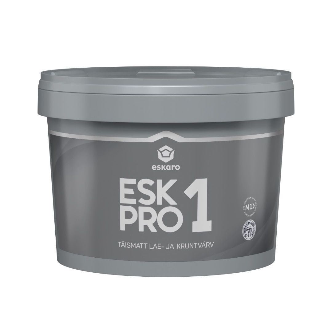 Eskaro ESK PRO 1 valge täismatt vesialuseline värv lagedele ja seintele sisetöödeks.<br /><br><br /><br>Omadused:<br /><br>Suurepärase nakkevõimega.<br /><br>Hea kattevõimega.<br /><br>Mugavalt pinnale kantav, ei pritsi, ei voola, tasandub hästi.<br /><br>Peaaegu lõhnatu.<br /><br>Moodustab ühtlase, mittepeegeldava täismati pinnakatte.<br /><br>Kergesti lihvitav, võimaldades teha lihtsalt parandusi alsupinna pahtelduses.<br /><br>Täielikult kuivanud pind talub kerget puhastamist (3. klass EN13300 järgi).<br /><br>Vastab ehitusmaterjalide emissiooniklassi M1 nõuetele. Eritab ruumi siseõhku võimalikult vähe kahjulikke ühendeid.