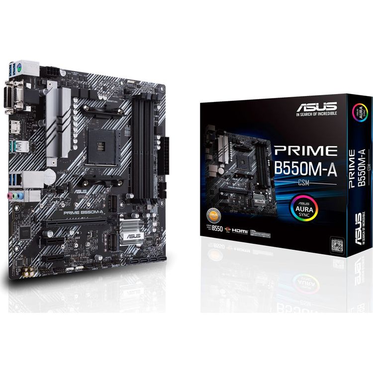 AMD B550 (Ryzen AM4) micro ATX motherboard with dual M.2, PCIe 4.0, 1GbE, HDMI/D-Sub/DVI, SATA 6Gb/s, USB 3.2 Gen 2 Type-A and connector support Aura Sync RGB AMD AM4 Socket: Compatible with 3rd generation AMD Ryzen processors Advanced cooling system: VRM heatsink, PCH heatsink and Fan Xpert 2+ Ultra-fast connections: dual M.2, PCIe 4.0, 1GbE, USB 3.2 Gen 2 Type-A Aura Sync RGB: Integrated Gen 2 addressable header for RGB LED strips, easy sync with Aura Sync enabled devices ASUS Prime Series motherboards are expertly engineered to unleash the full potential of 3rd Gen AMD Ryzen processors. With a solid power design, extensive cooling options, and smart tuning options, the Prime B550 Series motherboards provide daily PC users and builders with a host of customization options through intuitive software and firmware features. Customize your system A rich set of control options is the foundation of all ASUS Prime series motherboards. Prime B550 offers comprehensive tools to fine-tune every aspect of your system, allowing you to fine-tune the performance settings to perfectly suit the way you work - maximizing your productivity. UEFI BIOS The enhanced ASUS UEFI BIOS gives you everything you need to set up, customize and tune your system. It offers intelligently simplified options for people building a computer system for the first time, as well as advanced features for seasoned veterans. Cooling to the core Prime B550 series motherboards feature multiple integrated heatsinks and a set of hybrid fan headers to ensure your system stays cool and stable under heavy loads. VRM heatsink and thermal pads The VRM heatsink with the thermal pad underneath it increases the heat dissipation efficiency of the MOSFETs and chokes for better cooling performance. Build the system on a solid foundation Prime B550 offers all the essential features to accelerate your everyday productivity, keeping your system ready for action with consistent power, intuitive cooling controls, and flexible data transfer options. PCIe 4.0 M.2 (Max 64Gbps) Speed up with the built-in M.2 slot The M.2 PCIe 4.0 slot is compatible with drives up to 22110 format and supports RAID configured with NVMe SSDs - for an amazing performance boost. RAID drives with up to PCIe 4.0 bandwidth to enjoy the fastest data transfer speeds on the 3rd Gen AMD Ryzen platform. USB 3.2 Gen 2 Type-A The availability of multiple USB sockets allows you to create a high-end system packed to the brim with various peripherals. These also include 2 USB Type-A ports on the rear panel along with fast connectivity via USB 3.2 Gen 2 when used with a compatible case. Small details make a big difference The Prime B550 series adds refined details that enhance the user experience in every aspect, from the exclusive codec that guarantees crystal-clear sound of the highest quality, to the intuitive RGB lighting control with which you can personalize your system and give it a unique character. Perfect sound All the integrated features together guarantee a great sound Smart design and premium hardware components combine to deliver sound quality you've never experienced before. Audio zone shielding It separates the analog and digital signal zones, significantly reducing multilateral interference. Separate zones for the left and right channels They guarantee that crosstalk between audio paths will be minimal. Premium grade capacitors made in Japan The high-quality components used ensure intense timbre and exceptional sound fidelity. Aura Sync Outshine the Competition A perfectly tuned enthusiast system deserves an aesthetic to match. ASUS Aura gives you complete RGB lighting control with a range of practical presets to control the motherboard's integrated RGB LED lights, as well as strips and devices connected to the onboard RGB headers. All of this can be easily synchronized with Aura-enabled equipment, the range of which is constantly growing. Gen 2 addressable RGB header The Gen 2 Addressable RGB header can now detect the number of LEDs on Gen 2 addressable RGB devices, allowing the software to automatically match the lighting effects to the device's lighting. New the socket also offers backward compatibility with already available Aura RGB devices. Armory Crate Armory Crate is a new software utility designed to give you centralized control of your supported products through a single, intuitive interface. Armory Crate also allows you to control ASUS product settings, including keyboard and mouse settings. The software even offers a special product registration function and an overview of the latest developments and events, so you'll always be in touch with the ASUS community.