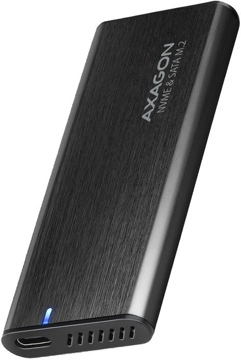 | Arvutitark OÜ | Axagon EEM2-GAM USB-C Gen2 M.2 NVMe/SATA SSD Enclosure Tootekood: EEM2-GAM GTIN: 8595247908544 Disk drive docks and cases Gaming external AXAGON EEM2-GAM M.2 box with USB 10Gbps interface for M.2 NVMe or SATA SSD disks. The double-sided USB-C connector on the box enables a reliable connection. In the package you will find two cables to connect the box to your computer. One USB-C USB-C and the other USB-C USB-A. You can connect the box to any free USB port on the notebook. The transmission rate is up to 10Gb/s thanks to the fast USB 3.2 Gen 2 interface. The external M.2 box also supports other modern features e.g. UASP, TRIM and enables reading S.M.A.R.T. disk status monitoring information. A unique feature, thanks to the new chipset, is the possibility of using both M.2 NVMe and SATA disks. You don't have to think about what type of M.2 disk you put in the box. The advantage is the attachment of four different lengths of SSD cards - 30, 42, 60 and 80 mm. M.2 cards can be single-sided or double-sided. The box does not limit the capacity of inserted SSD. A great advantage is the screwless opening of the box. Just press the button on the side to release the bottom cover. Changing discs is so easy and fast. The stylish frame for M.2 drives will impress you with its premium gaming design in black with an elegant surface that will perfectly highlight your gaming setup. The RGB LED indication adds a stylish look and blends perfectly with any gaming laptop, further enhancing the atmosphere of your gaming environment. Also included is a functional sleeve that protects the box opening button, increases overall protection, and offers a loop for hanging. Aluminum box body and thermal conductive pad provides ideal cooling for the inserted M.2 SSD. This extends the life of the disk and prevents slowing down of the disk speed, so called. Thermal Throttling. Inserting an M.2 SSD into this box easily creates a fast, compact and versatile external drive that can be used not only with PCs and laptops, but also with mobile phones and tablets. Input: USB 10Gbps (USB 3.2 Gen 2), connector USB-C female. Compatible with 480Mbps, USB 5Gbps, USB4 a Thunderbolt 3/4. Device support: NVMe M.2 SSD disks, SATA M.2 SSD disks, designed for M key or B+M key card formats, NGFF 75-pin M key slot for M.2 drives. Other features: Supports transmission rates 10.000 / 5.000 / 480 Mbit/s. Support of M key or B+M key NVMe (PCI-Express) and SATA (AHCI) M.2 SSDs without maximum capacity limitation. Support of M.2 disks of these sizes 2230, 2242, 2260, and 2280 mm. Support of both one-sided and double-sided M.2 SSDs. Compliant with PCI Express Base Specification Revision 3.1a specification. Compliant with NVM Express 1.3 specification. Compliant with Serial ATA 3.2 specification (SATA/600), bit rates of up to 6 Gb/s (600 MB/s). Compliant with USB Mass Storage Class specification. The total bandwidth / transmission rate of the adapter is determined by the USB interface used (theor. 10 Gbit/s). The real adapter bandwidth / transmission rate is about 1000 MB/s (1 GB/s), it is given by the limits of the USB 3.2 Gen 2 interface. Supports BOT (Bulk-Only Transport). Supports UASP (USB Attached SCSI) for faster data transmission in Windows 8 and later. Supports TRIM functionality to limit gradual degradation of the SSD performance over time. Supports S.M.A.R.T. (Self-Monitoring, Analysis, and Reporting Technology) system monitoring disk condition. SSD boot support in external box. Possibility to connect your device while running thanks to the Hot Plug support. Full Plug and Play support. Power supply via USB bus up to 900mA from one USB port is sufficient in all cases. RGB LED indication. Heavy-duty aluminium body and thermal conductive pad helps to better cooling the M.2 SSD disk. Higher box surface temperature is not a defect - thanks to the aluminum body, the heat generated by the disk operation is better drained and transferred to the environment. Two USB type C or A male / USB type C male cable length 50 cm included in the package. Other data: Box dimensions 13 x 130 x 55 mm (H x W x D). Box weight 105 g (without cable and M.2 disk). Supported operating systems: Windows 7 / 8.1 / 10 / 11 and later, macOS, iPadOS, iOS, Linux, Chrome OS and Android. Compatibility is dependent on an updated operating system and support from the device manufacturer. Note: when Windows 7 used it is necessary to check OS support and driver availability with the M.2 SSD manufacturer. Package contains: USB-C 10Gbps external box for M.2 SSD, protective sleeve, USB-C - USB-C cable 50 cm long, USB-A - USB-C cable 50 cm long, 2 thermal conductive pads, multilingual manual CZ / DE / DK / ENG / ESP / FIN / FR / GR / HR / HU / IT / NL / PL / PT / RO / SK / SWE / TR / UA / BG / CN / ARA packed in a cardboard box with a hanging hole. | 30,60 € | Poodi | ||