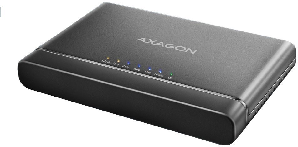 | Arvutitark OÜ | AXAGON ADSA-CC USB-C 10Gbps - NVMe M.2 SSD & SATA 2.5"/3.5" SSD/HDD CLONE MASTER 2 Tootekood: ADSA-CC GTIN: 8595247907332 Data cables and adapters The AXAGON ADSA-CC CLONE MASTER 2 universal USB-C 10Gbps adapter connects up to two drives to your computer quickly and easily at the same time. Easily connect any 2.5" or 3.5" drive directly to the adapter's external SATA connector. Simply insert the NVMe M.2 drive into the adapter body without the use of a screwdriver or other tools. You can also connect a SATA M.2 drive to the adapter using an external adapter such as the AXAGON RSS-M2SD. In the package you will find a USB-C USB-C cable with a fixed USB-C -> USB-A reduction. This solution enhances the versatility of the adapter, so you can connect it to any USB port on your computer, whether it's a double-sided USB-C connector or a traditional USB-A connector. Thanks to the cloning function without the need to connect to a PC, the adapter can be used as a stand-alone device for convenient duplication and disk imaging. The cloning direction is adjustable via a switch, so you can easily choose whether to clone the contents of an NVMe M.2 drive to a SATA drive or vice versa. After all the data is copied, the target disk is an exact copy of the original disk. This is the easiest way to transfer the contents of one drive to another, including a working operating system (Windows, macOS, Linux ...). In addition to the fast USB 10Gbps interface, the adapter also supports all important functions for working seamlessly with different types of drives, such as UASP for faster data transfer, TRIM for limiting the gradual degradation of SSD performance over time, S.M.A.R.T. for monitoring the status of the drives, BOOT for the ability to boot from drives connected to the adapter, Auto Spindown to automatically put drives to sleep during prolonged inactivity, Turn Off to shut down the drives after removing the device or putting the PC to sleep, and USB Bus Power to power the adapter including connected M.2 and 2.5" drives only from the USB port. In case of connecting a 3.5" drive, the included power adapter is of course already required. These features make the CLONE MASTER 2 adapter a very handy and useful tool for frequent work with different types of drives. This makes it an ideal helper for backup, migration, data transfer and storage, testing and cloning discs, etc. Input: USB 10Gbps (USB 3.2 Gen 2). Speed up to 10 Gbit/s. Connection via reversible USB type C female connector. M.2 slot device support: NVMe (PCI-Express) M.2 SSD one-sided and double-sided drives. Support of M.2 drives with a size of 2242, 2260, 2280 mm. Supports M-KEY & B+M-KEY NVMe M.2 SSD disks. No capacity limitation. Support for devices connected to the SATA port: SATA 2.5"/3.5" SSD/HDD. SATA M.2 SSD with M.2 -> SATA reduction e.g. AXAGON RSS-M2SD. No capacity limitation. Disk cloning feature: Cloning takes place without connecting the station to a computer. The target disk must have the same or larger capacity as the source disk, otherwise cloning cannot be started. Cloning direction switch - from NVMe M.2 drive to SATA drive or from SATA drive to NVME M.2 drive. SSD cloning speed up to 500 MB/s. The total disk cloning time depends on the capacity of the source disk, not the amount of disk data. Other features: Compatible with USB 10Gbps (USB 3.2 Gen 2). Backward compatible with USB 5Gbps (3.2 Gen 1 / USB 3.0) and USB 480Mbps (USB 2.0). Supports transmission rates 10.000 / 5.000 / 480 Mbit/s. Compliant with PCI Express Base Specification Revision 3.1a specification. Compliant with NVM Express 1.3c Specification. The total adapter bandwidth / transmission rate is determined by the USB 3.2 Gen 2 interface used (theoretically up to 10 Gbit/s). The real adapter bandwidth / transmission rate is about 1.000 MB/s (1 GB/s), it is given by the limits of the USB 3.2 Gen 2 interface. Compliant with Serial ATA 3.0 specification (SATA/600), transmission rates of up to 6 Gb/s (600 MB/s). Compliant with Serial ATA 2.0 specification (SATA/300), transmission rates of up to 3 Gb/s (300 MB/s). Compliant with Serial ATA 1.0 specification (SATA/150), transmission rates of up to 1.5 Gb/s (150 MB/s). Compliant with USB Mass Storage Class specification. Supports UASP (USB Attached SCSI) for faster data transmission in Windows 8.1 and later. Supports TRIM functionality to limit gradual degradation of the SSD performance over time. Supports S.M.A.R.T. (Self-Monitoring, Analysis, and Reporting Technology) system monitoring disk condition. Support for booting from disks connected to the adapter. HDD Auto Spindown - automatic spinning down when they idle for 10 minutes. HDD Turn Off - turns off the drive after removing the device or spinning down the PC. Full Plug and Play support. Connection via USB-C female connector. Cable USB-C male USB-C male 30 cm length + USB-C -> USB-A reducer included. Adapter dimensions 102 x 68 x 15 mm. Adapter weight 73 g (without accessories). Power: USB Bus Power - for M.2 and 2.5" drives, power via the USB bus is sufficient. Self Power - for 3.5" drives, power is required using the included external AC/DC adapter 12V - 2A with a 150 cm cable. Power switch. LED indication: the green LED indicates that the adapter is powered on (permanent light). 2x orange LED indicates connection for each of the disks (permanent light) and data transmission (blinking). 4x blue LED indicates cloning process 25% -50% -75% -100% (blinking), resp. cloning completion (permanent light). Supported OS: Windows 8.1 / 10 / 11 and later, Windows Server 2012 R2 / 2016 / 2019 / 2022 and later, Mac OS X 10.x and higher, Linux with kernel 2.6.x and higher. Package contains: M.2 + 2.5"/3.5" SSD/HDD adapter, power adapter 100-240V / 12V-2A, 4 thermal conductive pads, USB-C USB-C cable 30 cm long + USB-C -> USB-A reduction, multilingual manual CZ / DE / DK / ENG / ESP / FIN / FR / GR / HR / HU / IT / NL / PL / PT / RO / RU / SK / SWE / TR / BG