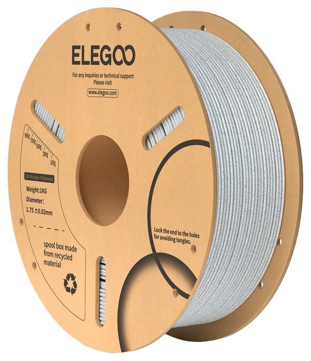 PLA Marble Filament by ELEGOOMarble-colored filament from ELEGOO allows you to create unique models with a realistic stone finish. Thanks to additives that give the surface the characteristic marble effect, the prints gain an aesthetic that is ideal for decorations, figurines or architectural mock-ups. The material is based on PLA (polylactide - a plant-based biodegradable plastic), so it is environmentally friendly. There is 1 kg of filament on the spool, which is enough for many medium and large prints.Stable and clean printingThe product has a diameter of 1.75 mm and a very precise dimensional tolerance (± 0.02 mm), which ensures even feeding into the printer without jams. It adheres well to the work table and does not create bubbles or excessive threads (known as stringing), which minimizes material waste and saves time. The result is smooth, durable models with a uniform appearance.Practical and eco-friendly spoolsFilament spools are made of cardboard, making it easy to recycle and reducing the product's environmental impact. In addition, each spool is precisely wound by machine and controlled by hand to prevent tangling. Three holes in the spool make it easy to see how much material is left. GeneralManufacturerELEGOOModel50.203.0113ColorMarbleWeight1 kg Recommended print settingsDrying settings before printing55 ± 5°CAmbient temperature and humidity≤ 50°C, ≤ 20% relative humidity (store with moisture absorber)Nozzle temperature190 - 230°CTable temperature (depending on printer and surface)35 - 65°CType of working surfaceTextured PEI (polyetherimide - a durable, adherent material used as a base for 3D printing) or other compatible surfacePrinting speedLess than 300 mm/s Physical propertiesDensity1.26 g/cm³Melting point158°CDeflection temperature under load57°CSoftening temperature (Vicat test)62°C Mechanical propertiesTensile strength (XY-measurement made in the horizontal plane of the print, where the material is strongest)38 ± 3 MPaElongation at break (XY)10,5% ± 2,1%Bending strength (XY)72 ± 5 MPaBending modulus (XY)2993 ± 182 MPaImpact strength (XY)66.2 ± 3.9 kJ/m²