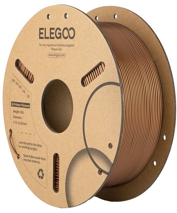 PLA Bronze Filament from ELEGOOBronze-colored filament from ELEGOO with a subtle metallic sheen allows you to create models that look elegant and stylish. This effect works great for figures, props, costume details and decorations where visual depth and a classic finish are important. The material is based on PLA (polylactide - a plant-based biodegradable plastic), so it is environmentally friendly. There is 1 kg of filament on the spool, which is enough for many medium and large prints.Stable and clean printingThe product has a diameter of 1.75 mm and a very precise dimensional tolerance (± 0.02 mm), which ensures even feeding into the printer without jamming. It adheres well to the work table and does not create bubbles or excessive threads (known as stringing), which minimizes material waste and saves time. The result is smooth, durable models with a uniform appearance.Practical and eco-friendly spoolsFilament spools are made of cardboard, making it easy to recycle and reducing the product's environmental impact. In addition, each spool is precisely wound by machine and controlled by hand to prevent tangling. Three holes in the spool make it easy to see how much material is left. GeneralManufacturerELEGOOModel50.203.0465ColorBrownWeight1 kg Recommended print settingsDrying settings before printing55 ± 5°CAmbient temperature and humidity≤ 50°C, ≤ 20% relative humidity (store with moisture absorber)Nozzle temperature190 - 230°CTable temperature (depending on printer and surface)35 - 65°CType of working surfaceTextured PEI (polyetherimide - a durable, adherent material used as a base for 3D printing) or other compatible surfacePrinting speedLess than 300 mm/s Physical propertiesDensity1.26 g/cm³Melting point158°CDeflection temperature under load57°CSoftening temperature (Vicat test)62°C Mechanical propertiesTensile strength (XY-measurement made in the horizontal plane of the print, where the material is strongest)38 ± 3 MPaElongation at break (XY)10,5% ± 2,1%Bending strength (XY)72 ± 5 MPaBending modulus (XY)2993 ± 182 MPaImpact strength (XY)66.2 ± 3.9 kJ/m²