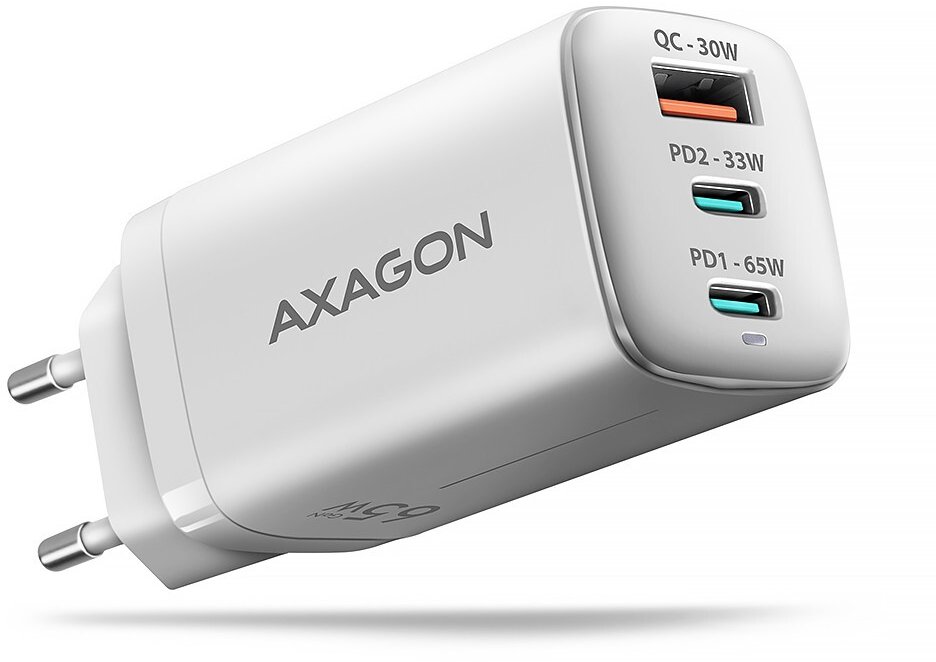 | Arvutitark OÜ | AXAGON ACU-DPQ65W 1x USB-A / 2x USB-C, PD 3.0 / QC4+ / PPS, 65W, weiß  Tootekood: ACU-DPQ65W GTIN: 8595247908216 Phone chargers The AXAGON ACU-DPQ65W GaN travel wall charger enables fast charging of up to three mobile devices at the same time. With 65W of total power, the charger charges notebooks, phones and other mobile devices at the highest possible speed. The adapter offers a standard USB-A connector, but also two double-sided USB-C connectors. Compact size and high performance is given by the new GaN technology used. The components used with Galium Nitride work with high efficiency, which allows you to achieve high performance with a small size. The charger is equipped with two Power Delivery 3.0 / Quick Charge 4+ USB Type-C outputs and one Quick Charge 3.0 USB Type-A output, enabling fast charging of not only smartphones and tablets, but also laptops. The Quick Charge 4+ technology allows up to 4 times faster charging of phones than a standard USB charger. Power Delivery 3.0 technology not only supports charging of modern phones, but also enables 65W PD charging of powerful laptops. The charger supports 20W PD charging for iPhone 12, 13, 14 and 15 and also offers 27W PD charging for iPhone 13 Pro, 14 Pro, 15 Pro and their Pro Max models. In addition, it supports 25W SFC charging for Samsung Galaxy S20 - S24, Note and Z Fold series and also offers 45W SFC 2.0 charging for Samsung Galaxy S20 - S24 Ultra, Tab S7+ - S9+, Tab S8 - S9 Ultra. The adapter is also compatible with other fast phone charging standards such as Apple iPhone, iPad, Samsung, Huawei, Honor, Xiaomi, as well as the Power Delivery 3.0 standard for charging Apple MacBook, Lenovo, Asus, HP, Dell and other laptops. The advanced protection system at the charging adapter output protects the device being charged from damage. The charger function also detects the device being charged and selects the optimal charging speed and progress. The body of the power adapter has a pleasant shape and size. Compared to classic charging adapters with the same parameters, the size of this charger is up to half the size. The combination of small dimensions, achieved with GaN technology and a wide range of input voltages, makes the charger an ideal travel helper. The operation of the charger is indicated by an elegant LED. Input: input voltage AC 100V-240V / 1.5A / 50-60 Hz (WIV function) supports multiple national power standards two-pin euro plug - integrated in the body of the charger Outputs: USB-A port QC (phones) max. 30W: 4.5V/5A, 5V/4.5A, 9V/3A, 12V/2.5A, 15V/2A, 20V/1.5A Charging technology: QC 3.0, QC 2.0, AFC, SCP, FCP, PE+, SMART, Apple 2.4A USB-C port PD2 (phones) max. 33W: 5V/3A, 9V/3A, 12V/2.5A, 15V/2A, 20V/1.5A, PPS: 3.3-11V/3A Charging technology: PD 3.0, PD 2.0, PPS, QC4+, QC 3.0, QC 2.0, SFC, AFC, SCP, FCP, PE+, SMART, Apple PD USB-C port PD1 (laptops, phones) max. 65W:5V/3A, 9V/3A, 12V/3A, 15V/3A, 20V/3.25A, PPS: 3.3-11V/5A Charging technology: PD 3.0, PD 2.0, PPS, QC4+, QC 3.0, QC 2.0, SFC 2.0, SFC, AFC, SCP, FCP, PE+, SMART, Apple PD Maximum performance using multiple ports: maximum power QC + PD2 24W, SMART mode charging is used (max. 5V/4.5A) QC + PD1 maximum power 63W PD1 + PD2 maximum power 63W QC + PD1 + PD2 maximum power 60W total maximum power 65W total maximum current 5A Supported charging technologies: Standard charging of all devices that support 5V and Apple iPhone 5, 6, SE, 7 charging. SMART - charging max. 5V/4.5A, Quick Charge 1.0, USB Battery Charging 1.2 (DCP 1.5A) and Apple 2.4A (iPad). PE+ - quick charging using MediaTek Pump Express+ and Pump Express+ 2.0 protocol FCP - quick charging using Huawei Fast Charge Protocol. SCP - quick charging (up to 20W) using Huawei SuperCharge Protocol. AFC - quick charging using Samsung Adaptive Fast Charging protocol. SFC - quick charging using Samsung Super Fast Charging and Super Fast Charging 2.0 protocol. QC - quick charging using Qualcomm Quick Charge 2.0, Quick Charge 3.0 and Quick Charge 4+ protocols. PPS - quick charging using Programmable Power Supply protocol (part of USB PD 3.0 and QC4+). PD - quick charging using USB Power Delivery 2.0 and Power Delivery 3.0 protocol. Examples of supported phones, tablets and laptops: SFC - quick charging (up to 25W) of Samsung Galaxy S20, S21, S22, S23, S24 series, Note 10, 20 series, Z Fold 2, 3, 4 series. SFC 2.0 - quick charging (up to 45W) of Samsung Galaxy S20, S21, S22, S23, S24 Ultra, Tab S7+, Tab S8+, Tab S9+, Tab S8 Ultra, Tab S9 Ultra. PD - quick charging of Apple iPhone 8, 8 Plus, X, XS, XS Max, XR, 11, 11 Pro, 11 Pro Max phone. PD - quick charging (up to 20W) Apple iPhone 12, 12 Mini, 12 Pro, 12 Pro Max, 12, 12 Mini, 12 Pro, 12 Pro Max, 13, 13 Mini, 14, 14 Plus, 15, 15 Plus phone. PD - quick charging (up to 27W) Apple iPhone 13 Pro, 13 Pro Max, 14 Pro, 14 Pro Max, 15 Pro, 15 Pro Max phone. PD - quick charging (up to 65W) of Lenovo, HP, Dell, Acer, Asus, Apple MacBook Air, MacBook Pro, iPad mini, iPad Air, iPad Pro and others notebooks. The charger supports WIV, AIC and CC functions: Wide Input Voltage - function of a wide range of input voltage; it protects the adapter against undervoltage and overvoltage at the input and allows the use of more national power standards. Automatic Intelligent Communication - function of automatic recognition of the connected device to select optimal charging parameters. Constant Output Current - the current hold function prevents the output power fluctuations; this function ensures steady course of charging. Complex output protection: OCP, OVP, OTP, OSP: Over Current Protection. Protection of output against current overload. Over Voltage Protection. Protection against overvoltage at the output. Over Temperature Protection. Protection against overheating of the adapter. Output Short Circuit protection. Short circuit protection at the output. Other features: dimensions of the charger body 103 x 36 x 32mm including a plug, weight: 118 g, material: non-flamma