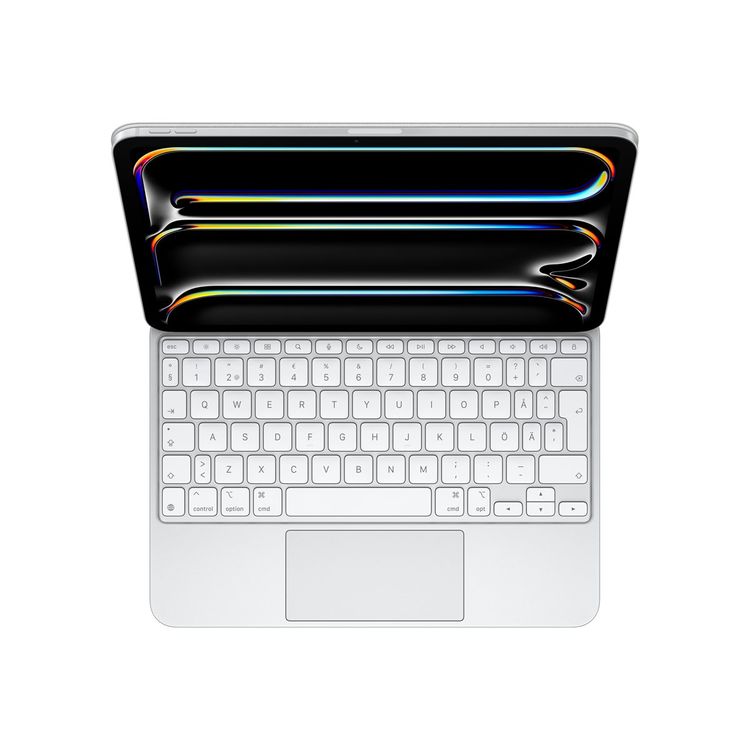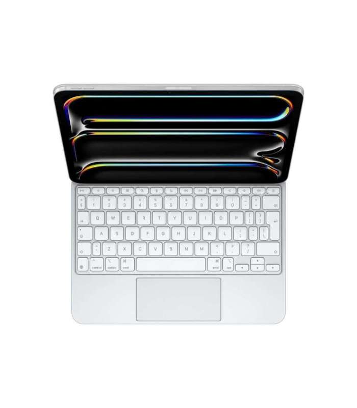 Magic Keyboard for iPad Pro 11-inch (M4) English (USA) White The Magic Keyboard for iPad Pro is a fantastic combination of keyboard and trackpad in a sleek, portable design with an aluminum palm rest. It features a row of 14 function keys, providing quick access to essential functions like screen brightness and volume control, and includes a USB-C port for charging. The stand elegantly lifts the device above the keyboard and allows for effortless adjustment of the screen angle. The new, larger trackpad with haptic feedback is perfect for precision tasks like editing spreadsheets or selecting text, and it makes navigation simple with familiar, intuitive Multi-Touch gestures. The durable case protects both the front and back of the iPad Pro, ensuring safety wherever you take it. Sleek and portable design with an adjustable stand that allows for easy screen angle adjustments. Built-in, larger glass trackpad with haptic feedback for precise control. Row of 14 function keys for quick access to essential functions like screen brightness and volume control. Comfortable, backlit keys with a scissor mechanism and 1 mm key travel for quiet and accurate typing. Supports cursor control and Multi-Touch gestures available in iPadOS. Durable aluminum hinge with a USB-C port for charging. Folds into a protective case, safeguarding both sides of the iPad Pro during transport.