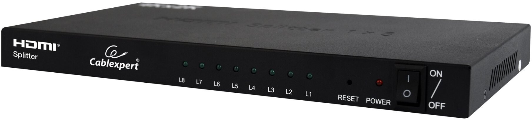 The Gembird Cablexpert DSP-8PH4-03 is a versatile video/audio splitter designed for seamless connectivity and high-definition performance. Featuring 8 HDMI input and output ports, it supports video resolutions up to 3840 x 2160 at 30 Hz, ensuring sharp visuals for various multimedia applications. The built-in HDMI signal amplifier enhances signal strength, enabling reliable transmission over longer distances without loss of quality. Whether for home entertainment or professional use, this splitter accommodates multiple devices while providing support for advanced audio formats like Dolby TrueHD and DTS-HD. Compliant with ISO 9002 and RoHS standards, the DSP-8PH4-03 is designed with safety and environmental considerations in mind. It features easy-to-read status indicators for power and port status, along with a reset button for quick troubleshooting. With 3D support and performance capabilities of 3.2 Gbps bandwidth, this device is ideal for users looking to elevate their multimedia experience without compromising on quality.