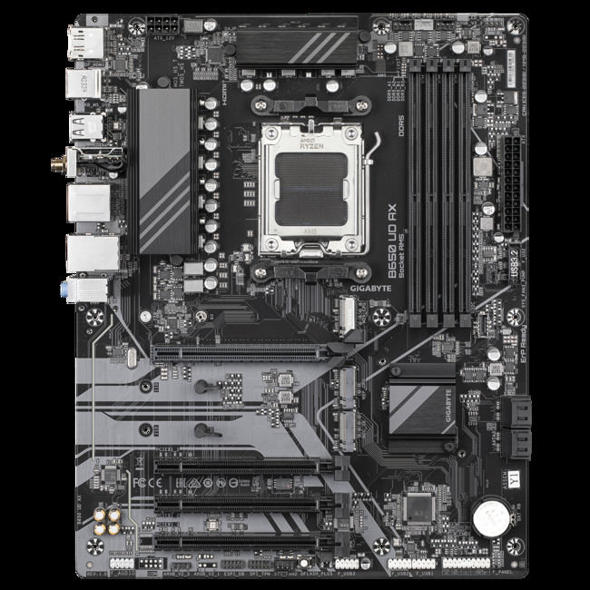 B650 UD AX - AMD Socket AM5: Supports AMD Ryzen 7000/ Ryzen 8000/ Ryzen 9000 Series Processors - Unparalleled Performance: 6+2+2 Phases Digital VRM Solution - Dual Channel DDR5: 4*SMD DIMMs with AMD EXPO & Intel XMP Memory Module Support - SuperSpeed Storage: 1*PCIe 5.0 + 2*PCIe 4.0 M.2 Connectors - EZ-Latch: PCIe x16 Slot with Quick Release Design - Fast Networks: Wi-Fi 6 802.11ax & GbE LAN - Extended Connectivity: DP, HDMI, Rear USB 10Gb/s - Smart Fan 6: Features Multiple Temperature Sensors, Hybrid Fan Headers with FAN STOP - Q-Flash Plus: Update BIOS Without Installing the CPU, Memory and Graphics Card Durable Performance GIGABYTE Ultra Durable motherboards built with optimal components inside and out provide prime performance and a timeless platform. Digital VRM Design The best VRM design ever built with the highest quality components. EXPO & XMP Support DDR5 EXPO & XMP Overclocking Up to 8000 and Beyond. GIGABYTE is offering a tested and proven platform with an extreme memory performance boost. Future Connectivity The ultimate connectivity with blazing data-transfer speeds through the next-generation network and storage. 802.11ax Wi-Fi The Wireless solution 802.11ax Wi-Fi enables gigabit wireless performance, provides smooth video streaming, better gaming experience, fewer dropped connections, and speeds up to 2.4Gbps. Moreover, Bluetooth 5.3 provides 4X the range over BT 4.2 and faster transmission. GbE LAN with Bandwidth Management Helps to improve network latency and maintain low ping times to deliver better responsiveness in crowded LAN environments. PCIe 4.0 Hardware Design Featuring one or multiple PCIe 4.0 x16 slot and PCIe 4.0 M.2 slot support, GIGABYTE motherboards are ready to work with PCIe 4.0 devices to provide superior performance. Hi-Fi Audio High-End Audio Capacitors These high quality capacitors help deliver high resolution and high fidelity audio to provide the most realistic sound effects. Audio Noise Guard Essentially separates the board's sensitive analog audio components from potential noise pollution at the PCB level. Easy Friendly Innovative and intuitive hardware, software, and BIOS interface design to create your personal style. EZ-Latch Easily unlock the latch of the PCIe slot when removing the graphics card from the PCIe slot. Q-Flash Plus Update the BIOS easily without installing the CPU, memory, and graphics card. - STEP 1: Plug the 24-pin and 8-pin power supply cables into the motherboard. - STEP 2: Download the motherboard BIOS file and rename it to "gigabyte.bin". Save it to a USB flash drive formatted in FAT32. Insert the USB flash drive into the Q-FLASH PLUS USB port. - STEP 3: Press the Q-FLASH PLUS button, and the motherboard will start updating the BIOS automatically. Smart Fan 6 Ensures optimal cooling and quiet operation for your gaming PC, with support for PWM/DC fans and pumps, customizable settings, and intuitive temperature monitoring. - High Current Support: Each fan header supports PWM and DC fan and Water Cooling Pump, and up to 24W (12V x 2A) with Over-Current Protection. - Precision Control: Multiple temperature/fan speed control points for precise fan curve. - Dual Curve Mode: Slope/Stair dual mode for different user scenarios. - Fan Stop: Fan can stop completely below users' specified temperature point. Smart Fan 6 BIOS UI - Enhance Fan Curve UI: Enhance fan curve control with an expanded number of control points, from 5 to 7, and a larger fan speed graph, enabling users to have more precise and effortless control over fan curve settings. - Slope/Stair Dual Graph Mode: Switch between Slope and Stair modes to adapt to various user scenarios. Slope mode provides a linear fan speed curve, while Stair mode maintains a constant fan speed within specified temperature intervals. - Manual Input: For advanced users, manual input of fan speeds is available for fine-tuning and precise control over the cooling system. - EZ Tuning: Simplify the process with EZ Tuning by setting 4 points on a rough temperature/fan speed scale. Smart Fan 6 will quickly generate a fan curve based on these points. - Fan Curve Profile: Save your customized fan curve profile in the BIOS ROM, ensuring it remains intact even after BIOS updates. - Note: The picture is for reference and may vary by model. UC BIOS - Redesigned UI and UX: An intuitive operation interface with an aesthetically pleasing design. - Quick Access: 9 customizable option slots for effortless access in Easy Mode. - PerfDrive: Exclusive BIOS settings that optimize the performance based on the cooling configuration GIGABYTE Control Center Unified software platform for all Gigabyte supported products. - Intuitive user interface - Modularized control - Auto update