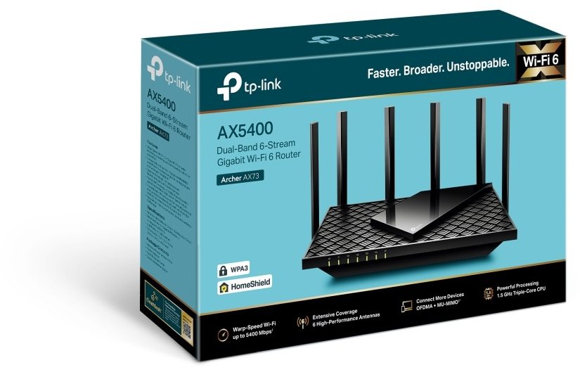 | Arvutitark OÜ | TP-LINK Archer AX73 - AX5400 Dual-Band Wi-Fi 6 Router Tootekood: ARCHERAX73 GTIN: 6935364010263 Routers Gigabit WiFi for 8K Streaming – 5400 Mbps WiFi for faster browsing, streaming, and downloading, all at the same time.† Fully Featured Wi-Fi 6 – Equipped with the advanced structure of 4T4R and HE160 on the 5 GHz band to enable ultra-fast 4.8 Gbps connections. Connect 200+ Devices§ – Supports MU-MIMO and OFDMA to reduce congestion and quadruple the average throughput.‡** Extensive Coverage – 6 antennas and Beamforming ensure broad coverage. HomeShield – TP-Link's premium security services keep your home network safe with cutting-edge features for network and IoT protection.* More Vents, Less Heat – Increased vent area unleashes the full power of the entire device. USB Sharing – 1× USB 3.0 port enables easy media sharing and private cloud creation. Easy Setup – Set up the router in minutes with the Tether app. Link Aggregation – Static Link Aggregation (LAG) available with 2 LAN ports. | Kohal | 119,90 € | Poodi | |