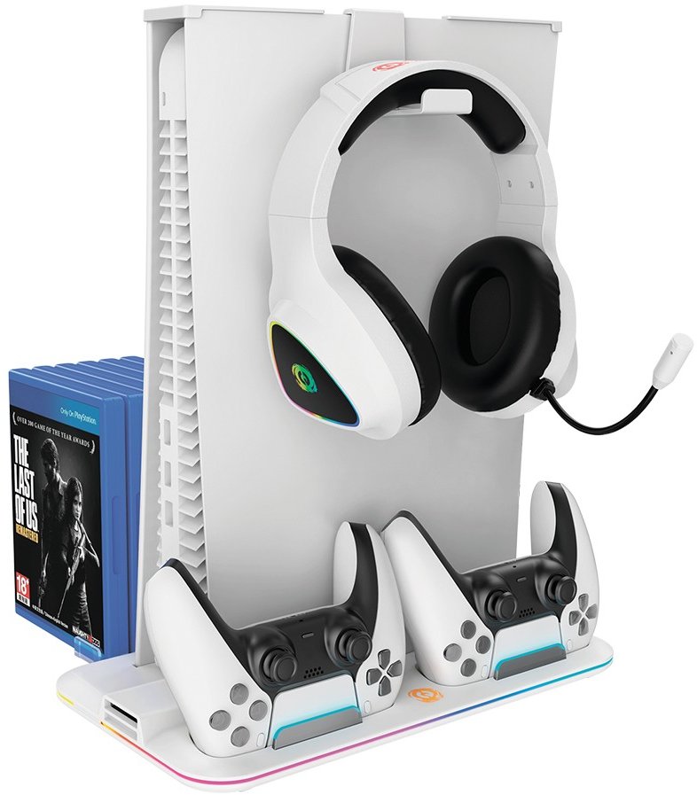 Multifunctional console cooling stand CS-51 The PlayStation 5 is a powerhouse console capable of running amazing games and delivering amazing experiences. With all that power comes heat, and you probably noticed how hot your console gets during those intense gaming sessions. This can negatively impact the performance and longevity of your console. Well, we've got just the thing to keep your console cool as a cucumber: the Canyon PS5 Cooling Stand is the ultimate solution to keep your device operating at peak efficiency. Equipped with a high-speed fan featuring three adjustable speeds, this cooling stand effectively dissipates heat, preventing overheating and extending the lifespan of your console. What’s more, it is fully compatible with PlayStation 5 Slim — so no device gets left out when it comes to staying cool. We included the Type C cable of the right size to power this cooling system from the console’s USB C port. The stand supports simultaneous charging for two original PS5 controllers, and an LED light indicator will show the charging status. Keep your controllers fully charged and ready for action, eliminating downtime and interruptions. There’s another USB-A port to charge… well, whatever you want! Stay organized with the integrated disc storage, capable of holding up to six game cases. The dedicated accessory compartment provides a secure and dust-free storage solution for your gaming peripherals, while the headset holder keeps your headphones neatly organized. Phew, that's a lot of features! So if you want to keep your PS5 in great shape, this cooling stand is a must-have. Think of all the extra hours of gaming without any pesky overheating issues. It's a win-win. Grab your cooling stand today! Built-in High-Speed Fan Engineered for maximum cooling efficiency, the high-speed fan spins at up to 5000 RPM to rapidly dissipate heat generated by your PlayStation 5. With three adjustable fan speed settings, you can fine-tune the airflow to match your gaming intensity and ambient temperature, ensuring optimal cooling performance while minimizing noise. Type-C Port Conveniently powered by your PlayStation 5, the cooling stand utilizes a dedicated Type-C port for a clean and clutter-free setup. The included Type-C cable is precisely designed to reach your console's USB-C port without excess length, preventing cable tangles and enhancing overall aesthetics. Simultaneous Charging for Two PS5 Controllers Keep your gaming sessions uninterrupted with the dual controller charging stations. Effortlessly charge up to two PlayStation 5 DualSense controllers simultaneously. The clear charging indicators provide real-time status, allowing you to monitor the charging progress of each controller. RGB Backlight The device’s bezel rocks a breathing RGB backlight. Choose from a variety of stunning color combinations and breathing effects to match your gaming mood or personalize your setup. . Adjust the color and mode to your liking, or turn it off completely… But it does look great. Storage & Extras The Canyon cooling stand has everything you need for storing your accessories: a disc storage for 6 keep cases, a dust-proof compartment on the top for your remote and other accessories, and a headset holder. There’s another USB 2.0 port to charge whatever you might need. *controllers, ps5 and headphones are not included in the set, only the stand
