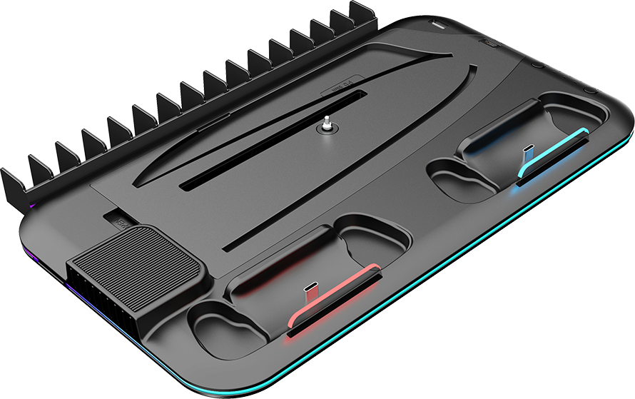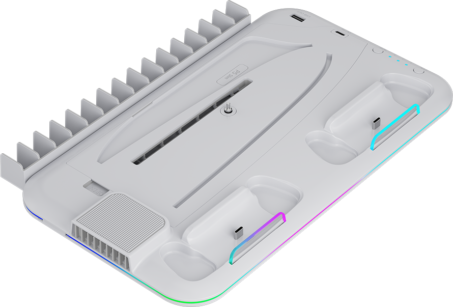 Multifunctional Console Cooling Stand CS-51 The PlayStation 5 is a powerhouse console capable of running incredible games and delivering amazing experiences. With all that power comes heat, and you've probably noticed how hot your console gets during intense gaming sessions. This heat can negatively affect the performance and lifespan of your console. Luckily, we've got just the thing to keep your console cool as a cucumber: the Canyon PS5 Cooling Stand is the ultimate solution to maintain your device at peak efficiency. Equipped with a high-speed fan featuring three adjustable speeds, this cooling stand effectively dissipates heat, preventing overheating and extending your console's lifespan. Moreover, it is fully compatible with the PlayStation 5 Slim—so no device misses out on staying cool. We include the right-sized Type-C cable to power this cooling system via the console's USB-C port. The stand supports simultaneous charging for two original PS5 controllers, and an LED light indicator displays the charging status. Keep your controllers fully charged and ready for action, eliminating downtime and interruptions. There’s also an additional USB-A port to charge... well, whatever you want! Stay organized with the integrated disc storage, capable of holding up to six game cases. The dedicated accessory compartment provides secure and dust-free storage for your gaming peripherals, while the headset holder keeps your headphones neatly organized. Phew, that's a lot of features! If you want to keep your PS5 in excellent condition, this cooling stand is a must-have. Think of all the extra hours of gaming without pesky overheating issues. It's a win-win. Grab your cooling stand today! Built-in High-Speed Fan Designed for maximum cooling efficiency, the high-speed fan spins up to 5000 RPM to rapidly dissipate heat generated by your PlayStation 5. With three adjustable fan speed settings, you can fine-tune the airflow to match your gaming intensity and ambient temperature, ensuring optimal cooling performance while minimizing noise. Type-C Port Conveniently powered by your PlayStation 5, the cooling stand uses a dedicated Type-C port for a clean and clutter-free setup. The included Type-C cable is precisely designed to reach your console's USB-C port without excess length, preventing cable tangles and enhancing overall aesthetics. Simultaneous Charging for Two PS5 Controllers Keep your gaming sessions uninterrupted with the dual controller charging stations. Effortlessly charge up to two PlayStation 5 DualSense controllers simultaneously. The clear charging indicators provide real-time status, allowing you to monitor the charging progress of each controller. RGB Backlight The device's bezel features a breathing RGB backlight. Choose from a variety of stunning color combinations and breathing effects to match your gaming mood or personalize your setup. Adjust the color and mode to your liking, or turn it off completely... but it does look great. Storage & Extras The Canyon cooling stand has everything you need for storing your accessories: disc storage for six game cases, a dust-proof compartment on top for your remote and other accessories, and a headset holder. There’s another USB 2.0 port to charge whatever you might need.