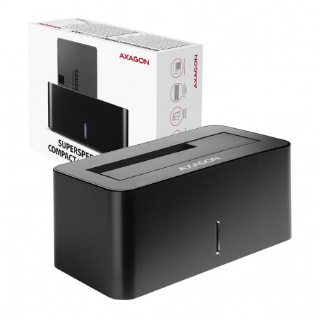 SuperSpeed USB AXAGON ADSA-SN COMPACT HDD/SSD DOCK docking station easily and quickly connects any SATA disk to your computer. A handy helper for the easiest and fastest way of connecting SATA disks to your computer - just plug the disk into the base. Automatic installation can be done even by the layman. SATA 6G interface with UASP support allows you to enjoy the speed of modern SSD disks. The TRIM feature support limits the gradual degradation of SSD performance over time. Reading of S.M.A.R.T. information monitoring the condition of the connected disks. Supports sleeping of both the connected disks and station. Low laid centre of gravity of the docking station for good stability. Rubber feet to reduce vibrations. Modern minimalist design of housing with aluminium casing. Input: USB 3.2 Gen 1 (USB 3.1 Gen 1 / USB 3.0) SuperSpeed USB rate of up to 5 Gbit/s. Connection via micro USB type B female connector. Device support: SATA III - 6 Gb/s (600 MB/s) interface, supports 2.5" HDD/SSD, supports 3.5" HDD, max. disk capacity all without limitation, max. 2.5" disk height- all without limitation. Other features: Compatible with USB 3.2 Gen 1 / USB 3.1 Gen 1 / USB 3.0, backward compatible with USB 2.0. Supports transmission rates 5000 / 480 Mbit/s (SuperSpeed / HighSpeed). Compliant with Serial ATA 3.0 specification (SATA/600), transmission rates of up to 6 Gb/s (600 MB/s). Compliant with Serial ATA 2.0 specification (SATA/300), transmission rates of up to 3 Gb/s (300 MB/s). Compliant with Serial ATA 1.0 specification (SATA/150), transmission rates of up to 1.5 Gb/s (150 MB/s). The total bandwidth / transmission rate of the station is determined by the USB interface used (theor. 5 Gbit/s). Supports UASP (USB Attached SCSI Protocol) and BOT (Bulk-Only Transport). SSD/HDD boot support in docking station. Possibility to connect your device while running thanks to the Hot Plug support. Full Plug and Play support. HDD Auto Spindown - automatic spinning down after period of inactivity lasting 15 minutes. HDD Turn Off - turns off the drive after removing the device or spinning down the PC. cable micro USB-B / USB-A 80 cm long is included. A decent blue LED indicating the connection to the computer's USB port (permanent light) and data transmission (blinking). Power switch. Power supply via a compact external AC/DC adapter 12V - 2A (24 W) with a 150 cm long supply cable. Station dimensions 130 x 65 x 59 mm. Weight 190 g. Supported OSs: MS Windows XP / Vista / 7 / 8 / 8.1 / 10 and later, Windows Server 2008 / 2012 / 2016 and later (supported are all 32- and 64-bit Windows OS versions), Mac OS X 10.x and higher, Linux with kernel 2.6.x and above.Note: Drivers are included with supported operating systems and are installed completely automatically. No other drivers need to be installed and are not even available. Package contains: USB 3.2 Gen 1 HDD dock, micro USB-B - USB-A cable 80 cm long, power adapter 100-240V / 12V-2A, multilingual manual CZ / DE / DK / ENG / ESP / FIN / FR / GR / HR / HU / IT / NL / PL / PT / RO / RU / SK / SWE / TR / BG / CN / ARA, packed in a cardboard box with clearly indicated parameters.