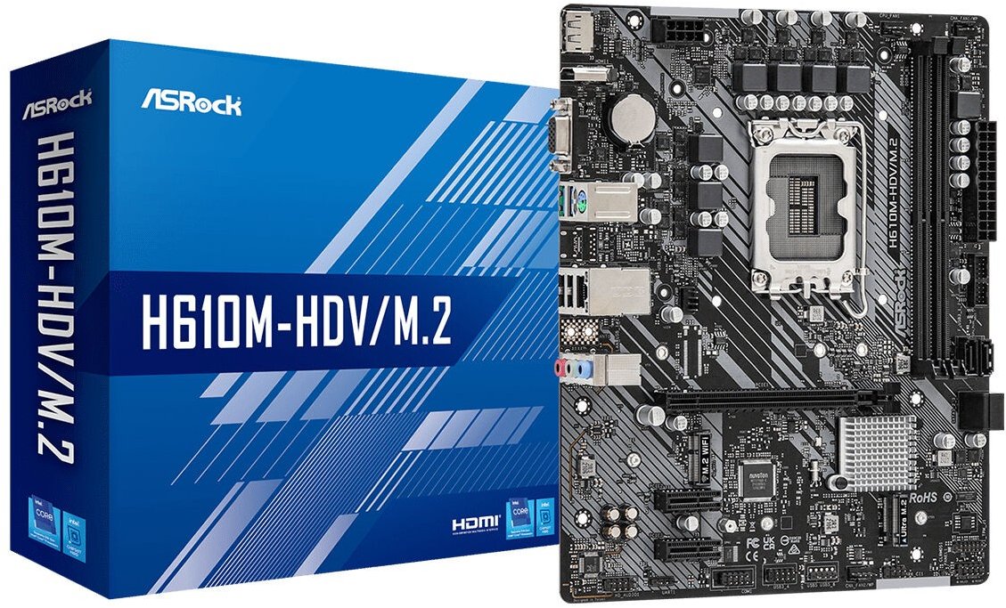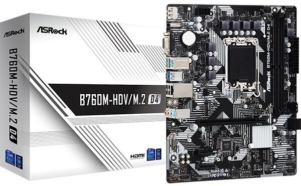 B760M-HDV/M.2 D4 motherboard Supports 13th and 12th generation Intel Core processors (LGA1700) 5+1+1 Power Phase Supports DDR4 5333MHz (OC) 1 PCIe 4.0 x16, 2 PCIe 3.0 x1, 1 M.2 Key E for WiFi Graphics outputs: HDMI, DisplayPort, D-Sub Realtek ALC887/897 7.1 CH HD Audio Codec 4 SATA3, 1 Hyper M.2 (PCIe Gen4x4), 1 Ultra M.2 (PCIe Gen3x4 & SATA) 1 USB 3.2 Gen1 Type-C (Rear), 5 USB 3.2 Gen1 Type-A (3 Rear, 2 Front), 5 USB 2.0 (2 Rear, 3 Front) Realtek 1G LAN Supports ASRock Automatic Driver Installer 5+1+1 Phase Power Layout Durable components and smooth power transfer to the CPU translate into enhanced performance for gamers. High Speed M.2 Connections(PCIe Gen4 x4) Support for PCI Express 4.0 M.2 SSDs, which can operate up to twice as fast as the previous 3rd generation for lightning-fast data transfers. M.2 (KEY E) for WiFi In addition to the integrated LAN port, users can also choose 802.11ac wireless connectivity via the M.2 (Key E) slot. *Wi-Fi module not included. 3 graphics outputs This float is equipped with the three most commonly used types of video outputs: D-Sub + DisplayPort + HDMI. *Support only with processors with integrated graphics cards. Please refer to the CPU support lists on the motherboard pages.