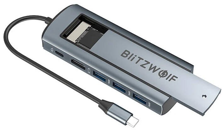 Adapter 6-in-1 HUB Blitzwolf BW-Neo TH13Looking for the perfect solution to expand the functionality of your laptop or computer? Introducing the Blitzwolf BW-Neo TH13 6-in-1 Adapter, which will provide you with all that and more. This versatile adapter not only combines the excellent quality of the Blitzwolf brand but also offers many benefits that will surely impress you.Uncompromising MultifunctionalityThis adapter is equipped with three USB 3.0 ports, ensuring lightning-fast data transfer and the ability to connect multiple devices simultaneously. Additionally, it features an HD Display Port, allowing you to connect a monitor with a resolution of up to 4K@30Hz, providing incredibly sharp visuals.High-Power ChargingWith a USB-C PD port supporting up to 100W of charging power, you can quickly charge your devices, whether they are smartphones, tablets, or laptops. You won't waste time waiting for a full charge.Fast Data TransmissionWith a USB 3.0 transmission speed of 5Gb/s, file transfer becomes a true pleasure. You save valuable time that you can allocate to other important tasks.Solid ConstructionThe housing made of high-quality aluminum alloy guarantees not only durability but also excellent protection against mechanical damage. The Blitzwolf BW-Neo TH13 Adapter combines reliability and sturdiness in one.Compatibility with SSD CardsThanks to the slot for SSD cards supporting M.2 SATA and M key interfaces, you can easily expand your computer's memory. This is an excellent solution for those who need additional space for their files.BrandBlitzwolfModelBW-NEO TH13ColorSilverDimensions131 x 21 x 50mmCable Length190mmMaterialAluminum Alloy (housing)InterfacesUSB3.0 Port x 3, HD Display Port x 1, USB-C PD x 1, SSD Card Slot x 1SSD Card SlotSupports M.2 SATA, M key interfaceDisplay OutputUp to 4K@30Hz (3840 x 2160)Output Power5V-20V / 5AFast ChargingYes, up to 100WUSB3.0 Transmission Speed5Gb/sOperating Temperature-10°C-45°C (±5°C)