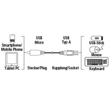 For connecting a USB stick to devices with a host compatible USB micro B socket, e.g. Archos 7 Home Tablet, Samsung Galaxy S II, S III, S4. High-speed data transfer of up to 480 Mbps. Gold-plated plug with low contact resistance for secure signal transmission. Double shielding for good reduction of electromagnetic interference. The inner conductor is made of copper which ensures best transmission properties. Sturdy plugs and moulded strain reliefs, high mechanical resistance. Suitable and tested for USB 2.0, backward compatible with USB 1.1. Twisted data lines (twisted pairs).