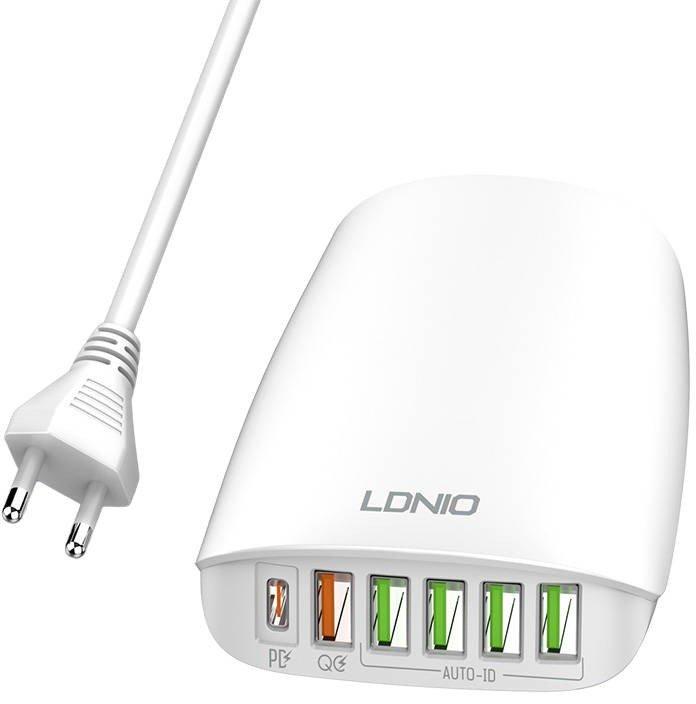 LDNIO A6573C EU x5 USB, USB-C 65W mains charger + Power cableCharge several devices at once with the LDNIO A6573C network charger. It offers 5 USB-A ports and 1 USB-C port that support fast charging protocols. It will find its use both at home and at work. It is made of flame-resistant PC plastic and comes with a number of safety features, making it safe to use.Charge several devices simultaneouslyThe LDNIO charger supports PD, QC3.0, FCP and SCP fast charging protocols, so it will allow you to renew your devices' power quickly. What's more, it intelligently adjusts the amperage according to the connected equipment. It also offers 5 USB-A ports and 1 USB-C port, allowing you to charge several devices at the same time.CompatibleAnother advantage of the LDNIO charger is its wide compatibility. With its help you will renew the energy of your smartphone, tablet, laptop or TWS wireless headphones. The product also works with Nintendo Switch game consoles and smartwatches.Safe useThe LDNIO A6573C mains charger is made of fire-resistant PC, so you can use it safely. What's more, it has a number of safety features, including overcurrent, overvoltage, overcharging, overheating, short circuit and electromagnetic field.Includedchargerpower cableManufacturerLDNIOModelA6573C EUColorwhiteInput voltage100-240V 50-60HZ 1.5A(MAX)Output voltageUSB-C (PD): 5V/3A 9V/3A 12V/3A 15V/3A 20V/3.25A 3.3-21V/3A 65W(MAX)USB-A (QC): 5V/3A 9V/2A 12V/1.5A 18W(MAX)x4 USB-A (AUTO ID): 5V/3.4A 17W(MAX)USB-C (PD) + USB-A (QC): 30W+18W=48W(MAX)USB-C (PD) + USB-A (QC) + x4 USB-A (AUTO ID): 30W+18W+17W=65WMaterialPC V0