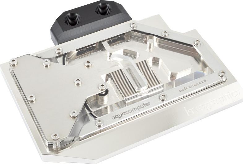 With the new NexXxoS GPX coolers Alphacool is again a step ahead! Optimum performance and quality in a new cooling design for a great price! A new sophisticated injection system means the GPU is actively cooled. All other chips are sufficiently cooled by the passive cooler which is also in contact with the watercooling block for extra efficiency. The patented technology “Philips structure” from the Alpha NexXxoS XP in 2004, was further developed improving the base plate. The Fins and channel structure has been further refined. The fins are now 0.5 x 0.5 mm and 2.5 mm high. This enables a very large and rapid heat transfer from the copper to the coolant. SLI mode: The inlet and outlet are positioned of easy use in SLI mode. Up to four graphics cards can also be connected with the Alphacool GPX SLI connector. Back plate: The GPX range always Includes a back plate which uses small passive fins to cool rear of the graphics card. Cooling fins: The passive front plate cooling uses 18mm deep cooling fins that cover the rest of the graphics card completely. Graphics card not included Compatibility: MSI Radeon RX 480, 8GB GDDR5, HDMI, 3x DisplayPort (V803-862R) ASUS Radeon RX 480 RX480-8G 8GB GDDR5 (90YV09Z0-U0NA00) GIGABYTE Radeon RX 480 8GB GDDR5 (GV-RX480D5-8GD-B) HIS Radeon RX 480 8GB GDDR5 (HS-480R8FSNR) MSI Radeon RX 480 8GB GDDR5 (V803-862R) PowerColor Radeon RX 480 4GB GDDR5 (AXRX 480 4GBD5-M3DH) PowerColor Radeon RX 480 8GB GDDR5 (AXRX 480 8GBD5-M3DH) Sapphire Radeon RX 480 4GB GDDR5 (21260-01) Sapphire Radeon RX 480 8GB GDDR5 (21260-00) XFX Radeon RX 480 Black Edition 8GB GDDR5 (RX-480M8BBA6) XFX Radeon RX 480 Core Edition 4GB GDDR5 (RX-480M4BFA6) XFX Radeon RX 480 Core Edition 8GB GDDR5 (RX-480P8LFB6) XFX Radeon RX 480 XXX OC 8GB GDDR5 (RX-480M8BFA6) Scope of delivery: 1x VGA cooler 1x Back plate Thermal pads Thermal Compound mounting material configurator for VGA cooler. The installation manual can be downloaded here compatibility list ATI