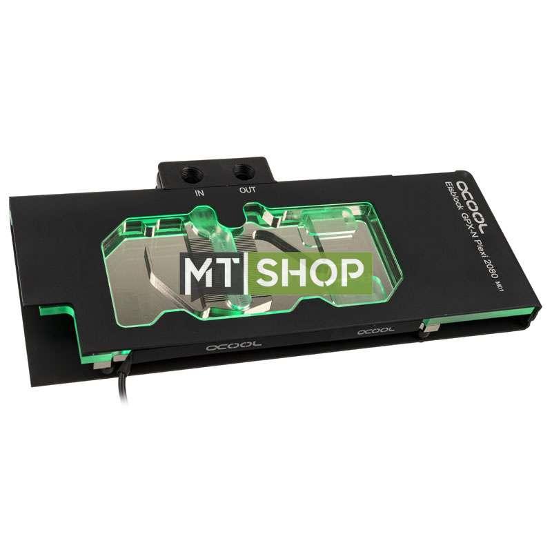 The world-renowned manufacturer, Alphacool, offers the Eisblock GPX a very noble and high-quality full cover water cooler for your graphics card. The Eisblock GPX is available in two versions; An eye-catching version with a plexiglass window with RGB lighting to really show off or a simple but elegant version made of acetal. Both coolers are based on an identical copper heat sink, which is completely nickel-plated. The surface area where the water flows is very large, so that all components that give off heat are actively cooled with water which increases performance. The 35 fins of the cooler are only 0.6 mm thick and cover even large GPUs completely. The large cooling surface is also ideal for graphics cards with HBM memory. The optical highlight of the Plexi variant, besides the very large window, of course also the complete and integrated RGB lighting. This is compatible with ASUS Aurora Sync, Biostar VIVID LED DJ, Gigabyte RGB Fusion or MSI Mystic. But pay attention to the connection on your mainboard. You may need a Male-to-Female adapter for some motherboards. With the Alphacool Eisblock GPX full cover water cooler for your graphics card you get a high-quality cooler with excellent cooling performance. You have the choice between a simple but noble black acetal version or a striking, wonderfully illuminated and chic plexi version with a large viewing window. Compatibility ASUS Dual GeForce RTX 2080 OC, DUAL-RTX2080-O8G, 8GB GDDR6 (90YV0C30-M0NA00) ASUS Turbo GeForce RTX 2080, TURBO-RTX2080-8G, 8GB GDDR6 (90YV0C31-M0NM00) EVGA GeForce RTX 2080 XC Gaming, 8GB GDDR6 (08G-P4-2182-KR) EVGA GeForce RTX 2080 XC Ultra Gaming, 8GB GDDR6 (08G-P4-2183-KR) Gigabyte GeForce RTX 2080 Windforce OC 8G, 8GB GDDR6 (GV-N2080WF3OC-8GC) Palit GeForce RTX 2080 GamingPro OC, 8GB GDDR6 (NE62080S20P2-180A) INNO3D GeForce RTX 2080 Gaming OC, 8GB GDDR6 (N20803-08D6X-1180VA24) INNO3D GeForce RTX 2080 Jet, 8GB GDDR6 (N20801-08D6-1180651) The Alphacool Eisblock GPX-N Plexi Nvidia Geforce RTX 2080 M01 is not compatible with the new NVLink Bright from Nvidia! If you are looking for an NVLink Bridge compatible cooler, please order the new Alphacool Eisblock GPX-N Plexi Light Nvidia Geforce RTX 2080 M01 (item no. 1015775) or the Alphacool Eisblock GPX-N Acetal Nvidia Geforce RTX 2080 M01 (item no. 1015770). ATTENTION: The cooler is only compatible with connections with a maximum thread length of 5 mm. Scope of Delivery Alphacool Eisblock GPX-N Plexi Nvidia Geforce RTX 2080 M01 Mounting material Thermal pads Thermal paste SLI compatible module 2x screw plug