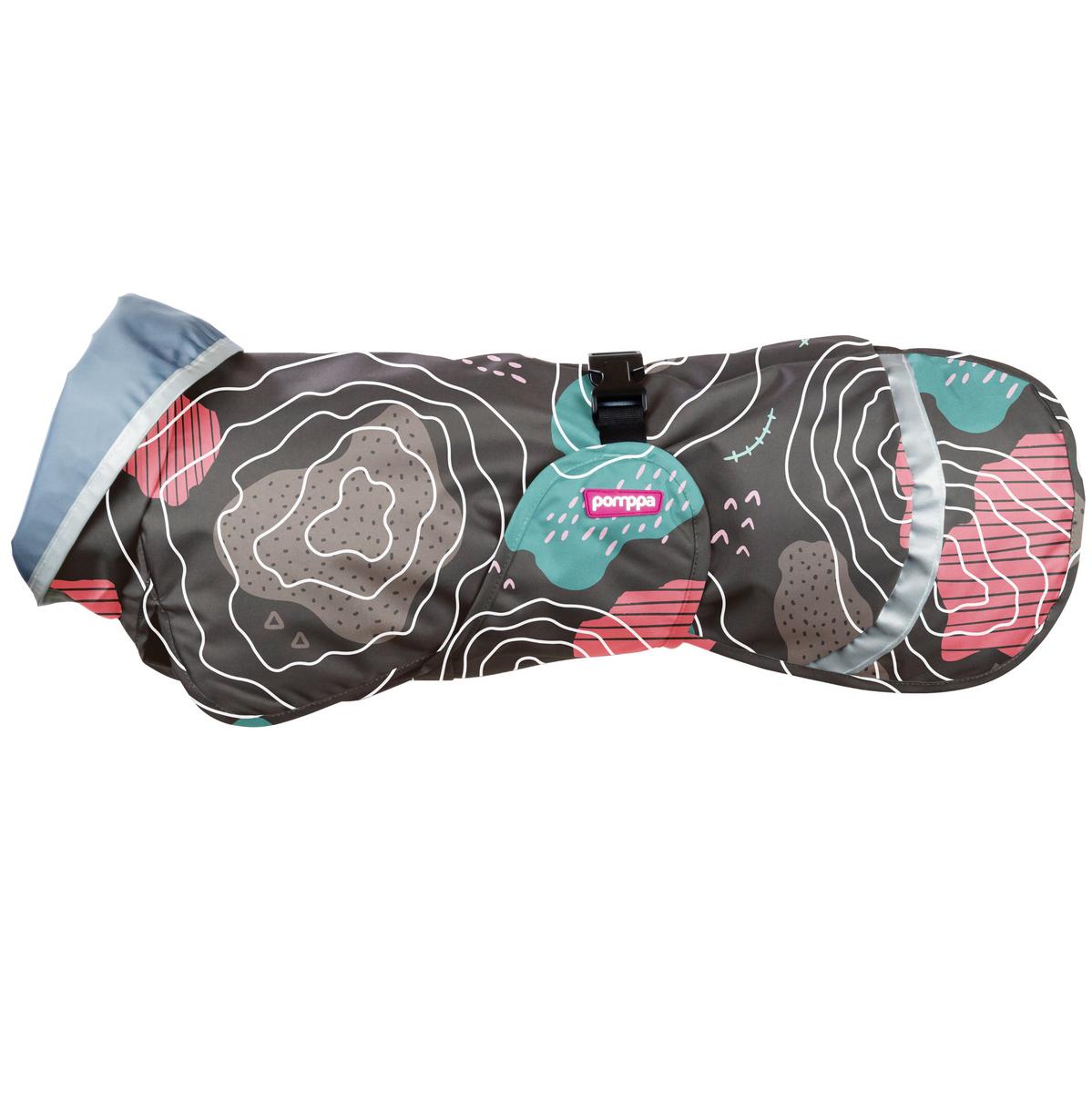 Pomppa Sade Map - waterproof jacket for dogs, multicolor SadePomppa is a thin and lightweight rain jacket for dogs, designed for year-round use. It provides excellent protection against wind, rain, and mud for the most important parts of the body. It can withstand not only light drizzles but also heavy downpours. It works well as a standalone jacket on warmer days or as an additional waterproof outer layer over thermal insulation. Ideal for both daily walks and more vigorous dog activities. Thanks to its unique design, it allows full freedom of movement for the dog, making it highly valued and often used for various sports activities and training.. The jacket is made from two types of material: the outer layer is waterproof polyester coated with a hydrophobic layer. In consideration of environmental welfare, it is made from fibers sourced from recycled polyester. The interior features a thin, smooth nylon lining that repels dirt and hair. The jacket covers the most important parts of the animal's body (back, neck, belly, and rear) and protects them from getting wet and cold. The back part extends to the lower back, while the bottom covers the chest and belly. The high, foldable collar protects the neck. The minimal number of seams reduces the risk of chafing and ensures greater waterproofing. Although the jacket has only one fastening at the waist and lacks straps or elastic bands for the hind legs, it fits the body perfectly and stays in place during any activity. It is easy to put on and take off. It is very lightweight, and when folded, it takes up little space. It can be easily taken on any adventures without adding weight to your luggage. Reflective elements ensure the dog's safety in poor lighting conditions.. Advantages of the SadePomppa waterproof dog jacket:. - Protection against wind, mud, and rain from light drizzles to heavier downpours without restricting the dog's movements. - Fits the body well and does not shift during movement. - Reflective elements for safety. - Opening in the collar for attaching a leash to the collar. - Waterproof, hydrophobic outer layer. - Smooth, thin lining that repels dirt and hair. - Lightweight, easy to fold and store. - Suitable for all dogs. - Easy to put on and take off. - Waterproof rating: 5,000mm water column. - Machine washable. - Can be worn alone or with an additional thermal layer. - Durable for years of everyday use. Tip: The SadePomppa jacket is designed for year-round use. Dogs with short fur, without an undercoat, and senior dogs may need additional thermal protection during colder periods. Pair it with the JumppaPomppa fleece underneath to ensure proper thermal comfort for your dog. Long-haired dogs with a thick double undercoat naturally tolerate low temperatures better, and SadePomppa may be all they need. However, if you're looking for something warmer, you can add the JumpaPomppa sweatshirt underneath to create a 3-in-1 outfit suitable for all year round, providing comfort in most cases.. How to care for Pomppa dog clothing:. - Avoid unnecessary washing. Frequent washing not only consumes water but also wears out the fabric and its coating. If there are no visible stains or dirt, try airing the product in a well-ventilated area or place it in the freezer to eliminate any odors.. - If necessary, wash the garment in a washing machine on a delicate cycle at 30°C.. - Do not use aggressive detergents, stain removers, bleach, or fabric softeners.. - After washing, hang the garment to dry. Do not tumble dry, iron, or dry clean.. - The outer layer is coated with a hydrophobic layer that degrades after multiple washes. You can restore it using waterproofing products commonly available in outdoor clothing stores.. Choosing the right size:. A well-fitting size ensures the best possible thermal protection and allows full freedom of movement for the dog. The right size protects the most important muscle groups and guarantees that the garment stays in place even during sprints or wild jumps. Pomppa jackets and sweatshirts are designed to fit various dog body types: slim, with a wide chest, or with pronounced and developed musculature. When selecting a size, it is important that the sweatshirt does not restrict the dog's mobility or cause discomfort in any other way. The determining factor in choosing the right size for the SadePomppa jacket is the length of the dog's back. We recommend avoiding choosing a smaller size than indicated by the length of the animal's back. Depending on the dog's proportions and coat type, the proper size may be larger than the size according to back length. Another factor to consider is that due to the thickness of the materials, for the coat to fit comfortably on the dog, its waist circumference should be slightly larger than the dog's waist circumference. Depending on the dog's proportions, the strap does not necessarily sit at the narrowest part of the dog's waist. | 0 | Vaata | |||