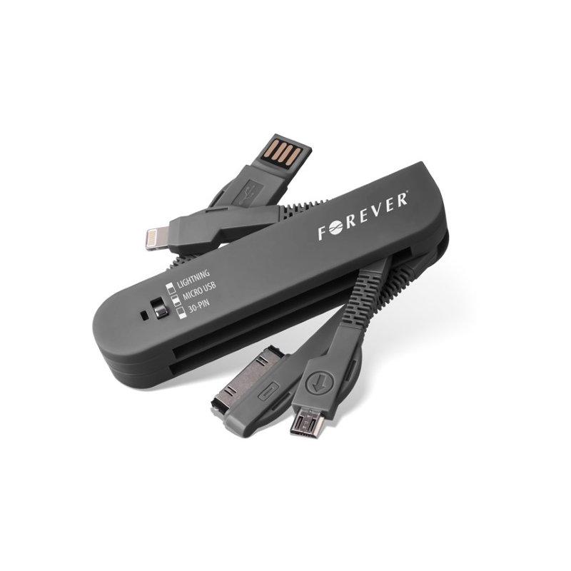 Producer: Forever Product Code: T_0013418 Connecting: 3in1 Set - USB 2.0 - Micro USB Data & Charging Cable + Apple Ligtning 8pin (iPhone 5/6) connecttion + Apple 30pin (iPhone 4/4S) connection Cable type: Plastic Cable adapter with 3cm long silicone Cables inside and connection switch Lenght: cable : 3cm Compatibility: 1 - Micro USB - Compatible with all mobile phones and devices witch use micro USB data connetion and charge standart! 2 - Apple Lightning 8pin - Compatible with all Aplle devices (iPhone 5/6) witch uses Lightning 8Pin Connection 3 - Apple 30 Pin - Compatible with all Apple devices (iPhone 4/4S) witch uses 30pin Flat Connection Packed in Forever Blister Package
