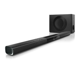 Type Soundbar speaker 2.1 CH wireless subwoofer Bluetooth® and NFC, HDMI ARC, 280W TotalRMSPower 280 Satellites 2x30 Subwoofer 220 TotalPeakPower n/a MaximumSPL n/a FrequencyResponse n/a InputImpedance n/a SoundEffects Sound Enhancement: Night Mode, Treble and Bass Control, Virtual Surround Sound RemoteControl Yes Power Power consumption: 20 W Power supply: 110-240V, 50/60 Hz Standby power consumption: < 0.5 W Inputs Integrated Connections: Bluetooth, NFC iPod/iPhone: via 3.5mm Audio In, via bluetooth Rear Connections: AUX in, Digital coaxial in, Digital optical in, Audio in 3.5 mm jack, HDMI 1.4 output (ARC) Front / Side connections: Audio in, USB PackageContents Quick start guide Remote Control Safety & Legal Leaflet Trademarks Sheet User Manual World Wide Warranty leaflet 1 x AAA Battery Power cord SystemRequirements n/a Dimensions n/a Width 843 mm Depth 60 mm Height 52 mm PackageDimensions 480 x 352 x 355 mm Weight 1.400 Kg PackageWeight 10.630 Kg Warranty 2 years