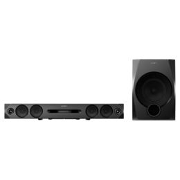 Type Soundbar speaker 2.1 CH wireless subwoofer Bluetooth® and NFC, HDMI ARC, 200W TotalRMSPower 200 Satellites 2x40 Subwoofer 120 TotalPeakPower n/a MaximumSPL n/a FrequencyResponse n/a InputImpedance n/a SoundEffects Sound Enhancement: Night Mode, Treble and Bass Control, Virtual Surround Sound Sound System: Dolby Digital RemoteControl Yes Power Power consumption: 20 W Power supply: 110-240V, 50/60 Hz Standby power consumption: < 0.5 W Inputs Integrated Connections: Bluetooth, NFC iPod/iPhone: via 3.5mm Audio In, via bluetooth Rear Connections: AUX in, Digital coaxial in, Digital optical in, HDMI 1.4 output (ARC) Top connections: Audio In (3.5mm), USB 2.0 PackageContents Power cord Quick start guide Remote Control Safety & Legal Leaflet Trademarks Sheet User Manual 1 x AAA Battery AC Adapter SystemRequirements n/a Dimensions 190 x 250 x 315 mm (Subwoofer) Width 843 mm Depth 60 mm Height 52 mm PackageDimensions 400 x 292 x 349 mm Weight 1.930 Kg PackageWeight 5.100 Kg Warranty 2 years