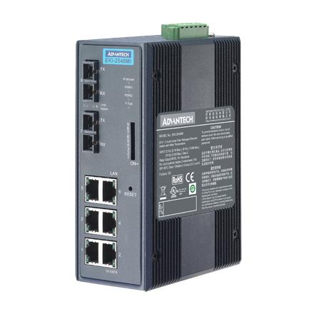 Main Features 6 Copper + 2 Multi mode Fiber Redundancy: Advantech X-Ring, Dual Homing, Couple Ring, and RSTP/STP (802.1w/1d) Configuration: SNMP v1/v2c, Web Backplane (Switching Fabric): 1.6Gbps Dual 12 ~ 48VDC power input and 1 relay output Supports wide operating temperature -40 ~ 75° C DIP switch for configure port alarm and enable Ring master Datasheet
