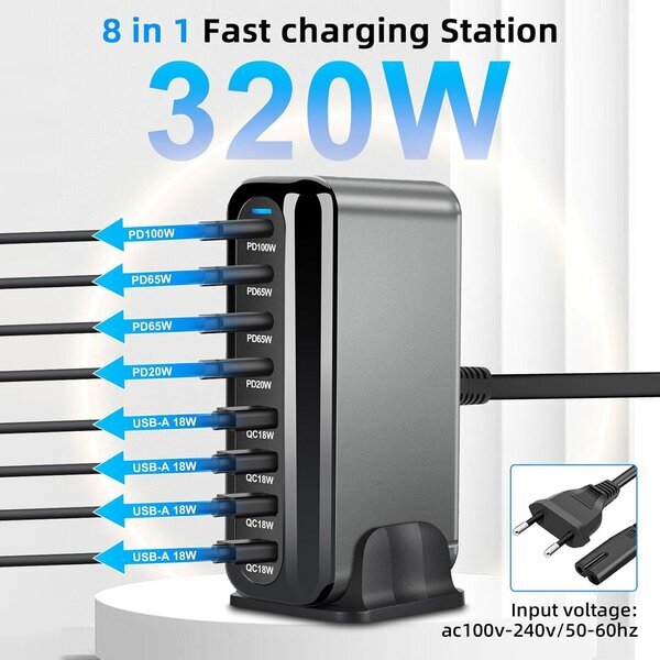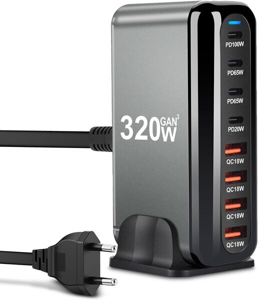 Arceli usb c laadija 320 w 8-pordiga, gan iii laadimisjaam, usb c laadija 4 x usb-c pd + 4 x usb-a qc4.0, kiirlaadija telefonile phone 16/15/14 pro max, samsung galaxy, macbook, pad, laptop (320 w)