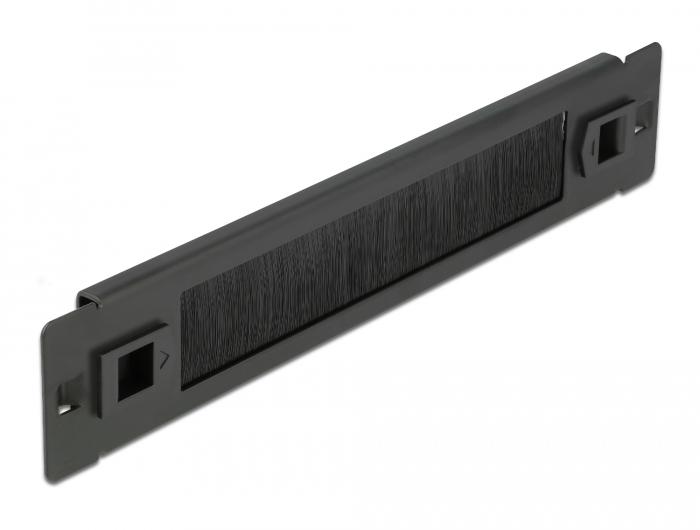 Description This brush strip by Delock is suitable for installation in a 10″ network cabinet. Installation without tools The special feature of this brush strip is that no tools are required for installation in a network cabinet. The integrated mounting clips can simply be pushed outwards to lock the panel in place. Proper laying of cables The network cables are simply routed from the front to the rear, so the view of the cables inside the network cabinet is blocked and the network cabinet leaves a tidy overall impression. Protection against foreign particles The included nylon brushes prevent ingress of dust and dirt. Specification • For mounting in 10″ network cabinet, 1U • Nylon brushes • Colour: black • Material: metal • Dimensions (LxWxH): ca. 254.0 x 44.2 x 10.0 mm Package content • 10″ brush strip