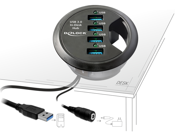 Selle Delocki hubi saab paigaldada lauas olemasolevasse väljalõikesse ja see võimaldab teil välja viia monitori, klaviatuuri ja hiire kaablid. See on praktiline ja ruumisäästlik lahendus, mis võimaldab USB-seadmeid hõlpsalt ühendada.