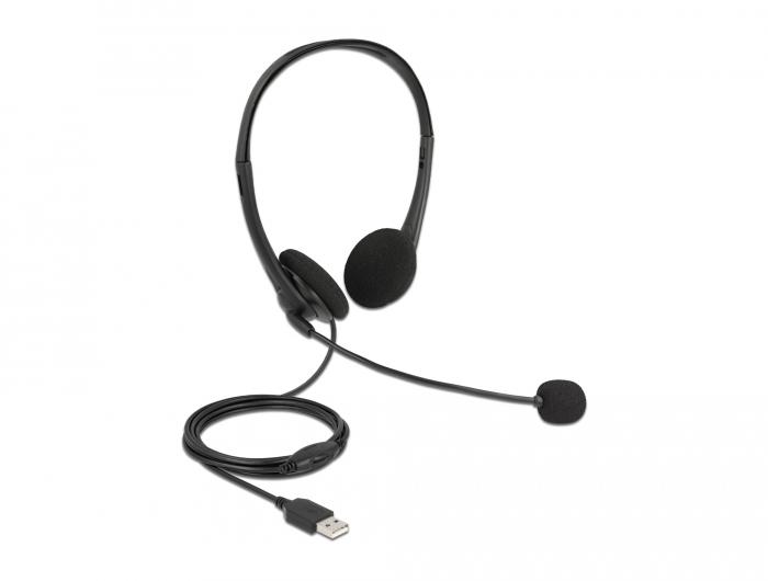 This USB headset by Delock is suitable for playback and recording of audio signals which can be used for working at home or for small business usage. It is ideally suited for Skype, video conferencing or online-courses. Optimal recordings & good stereo sound Due to the flexible microphone arm, the microphone picks up voice and vocal transmissions loud and clear. The 270° adjustable microphone arm allows the microphone to be used on the right or left side. The headset offers a sampling rate of up to 16 Bit / 48 kHz and can therefore record and playback audio signals in DVD quality. Comfortable to wear The headset has foam earmuffs and flexible ball-and-socket headphones, which adapt individually to the shape of the head. The headband can be adjusted to the required head size. Therefore the headset offers a pleasant wearing comfort even during longer use. Stepless volume control The cable has a volume control, which can be used to adjust the volume on the headset as required. Plug & Play Due to USB Plug & Play the headset is ready to use immediately and no driver installation is necessary. The headset works with all common operating systems such as Windows, Mac OS, Chrome OS and Linux. Specification • Connector: 1 x USB 2.0 Type-A male • Directivity: omnidirectional • Sensitivity: Headphone: 105 dB +/- 3 dB Microphone: -42 dB +/- 2 dBV/Pa • Frequency range: Headphone: 20 Hz - 20 kHz Microphone: 40 Hz - 13 kHz • Impedance: 32 +/- 5 Ohm • Sample rate: 16 Bit / 48 kHz for record and playback • Volume control (loud / quiet) • Cable length: ca. 2.4 m • Weight: ca. 90 g • USB bus powered • Plug & Play System requirements • Chrome OS • Linux Kernel 5.4 or above • Mac OS 10.9 or above • Windows 8.1/8.1-64/10/10-64 • PC or laptop with a free USB Type-A port Package content • USB headset • Windscreen • User manual