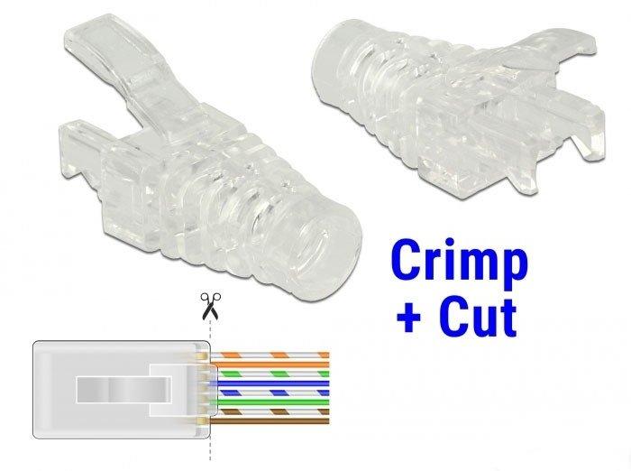 These compact flush strain relief boots are designed to fit the Delock RJ45 Crimp+Cut plugs. Specification• Also suitable for conventional RJ45 plugs• For cable diameter from 5.0 - 6.5 mm• Colour: transparent• Dimensions (LxWxH): ca. 28.4 x 19.4 x 11.8 mm System requirements• Delock RJ45 Crimp+Cut plug Package content • 20 x Strain Relief Boot for RJ45