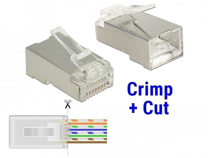 With this RJ45 plug by Delock and the matching Crimp+Cut tool a network cable can quickly and easily be connected to an RJ45 plug.The RJ45 Crimp+Cut plug allows leading the wires out to the front; this speeds up the installation and the wiring order can be checked. At the same time, the performance is improved because the wire pair remains twisted close to the connector. When crimping, all wires are contacted simultaneously and the excess cable ends are cut off. Specification• Connector: 1 x RJ45 plug• Shielded (STP)• Cat.6 specification• TIA-568A/B pinout• 3-prong contact• Contacts gold-plated: 1.27 um / 50 u″• For solid or stranded wire up to 0.511 mm (24 - 26 AWG)• For cable diameter from 5.0 - 6.5 mm• Housing material: polycarbonate• Colour: transparent• Dimensions (LxWxH): ca. 22.2 x 14.0 x 11.7 mm System requirements• Delock 86450 RJ45 Crimp+Cut Toolkit