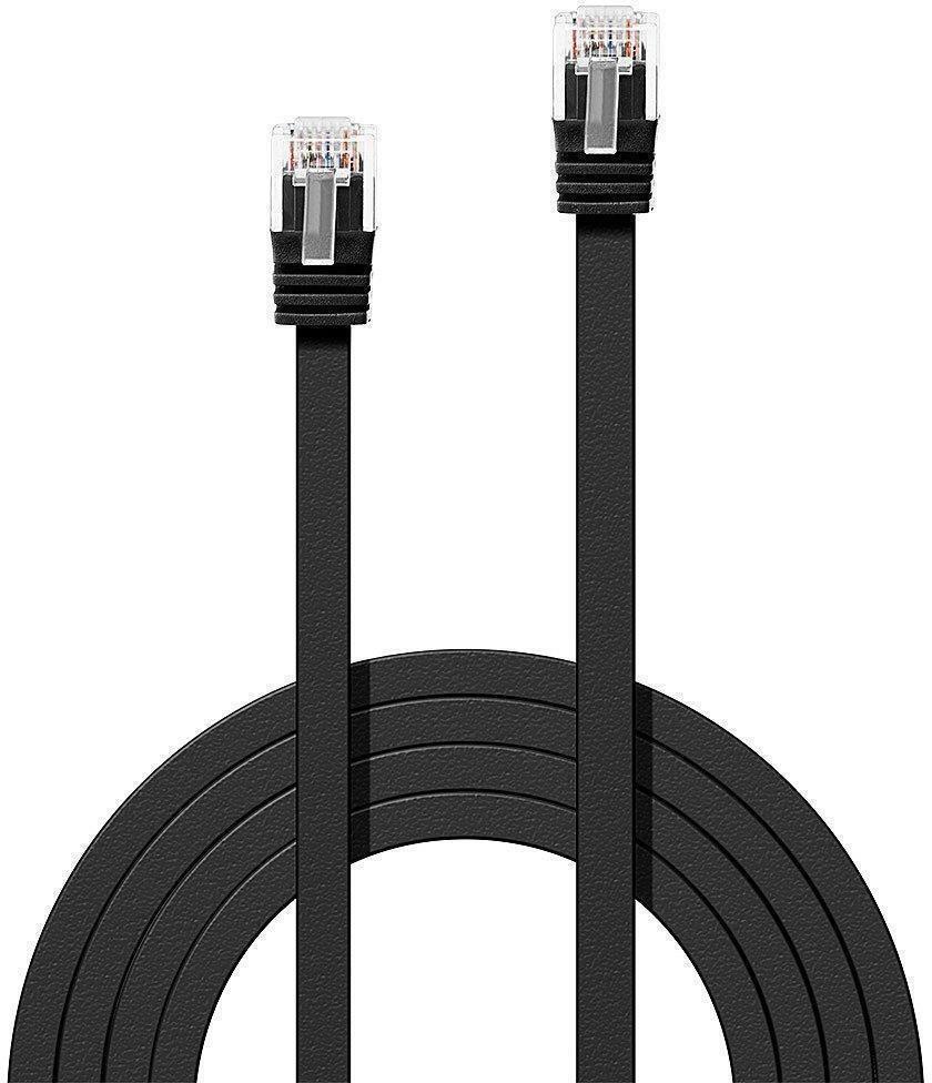 5m Cat.6 U/UTP Flat Network Cable, Black RJ45, M/M, 250MHz, copper, 32AWG - Twisted Pair Patch Cable with RJ45 connectors - Cat.6 U/UTP, Flat - Integrated snagless connector for latch protection - Gold plated pins for better conductivity and elimination of signal loss Cat.6 U/UTP flat network cable with support for bandwidth up to 250MHz and features a snagless design with gold plated contacts for ethernet standards up to 1GBase-T. Cat.6 cable for operating frequencies up to 250MHz. The unshielded version (U/UTP) can be used for Gigabit Ethernet thanks to the special design of the electrophysical parameter (NExT, FExT, etc.) despite the lack of shielding. Designed as flat ribbon cable for use in environments with restricted or limited installation space. These cables are manufactured and tested according to the ISO/IEC 11801 specification. The cables are packaged individually in a polybag. The gold-plated contacts ensure reliable, corrosion-free connections over extensive periods of time. A robust snagless strain relief design prevents damage to the connector latch during installation and removal. The very fleixible and thin ribbon cable construction allows the cables to be installed in restricted or limited spaces.