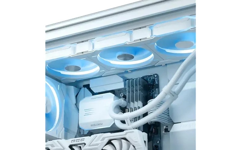 The PHANTEKS Glacier One 360M25 Gen2 is the perfect choice if you want to cool your gaming CPU to top performance while enjoying a quiet operation. With a 360-mm radiator, powerful pump, and optimized M25-G2 fans, it offers maximum cooling performance while the D-RGB lighting sets your setup in the spotlight.360 mm large radiator with M25-G2-D-RGB fans3x 120-mm PWM fans with minimal noise and maximum airflowPowerful pump ensures optimal coolingHigh-torque sleeves for durable tubesIntegrated fan on the pump module for optimal VRM coolingRubber pads on the fans prevent disturbing vibrationsInterconnect system for easy fan connectionsPHANTEKS Glacier One 360M25 Gen2: All-in-One Water Cooling for Gaming CPUsThe PHANTEKS Glacier One 360M25 Gen2 DRGB is a high-performance AIO water cooler with D-RGB fans and an additional integrated fan on the pump module. The lighting can be controlled via a single cable and provides brilliant, multi-colored lighting effects that give your setup the finishing touch.The large copper block of the AIO and the fin arrangement make it ideal for high-end CPUs, while the slim design of the radiator allows plenty of space in the case. The high airflow provides optimal cooling, ensuring greater performance while keeping your system cool.With its closed-loop design, 360-mm radiator, and efficient M25-G2 fans, the PHANTEKS Glacier One 360M25 Gen2 brings the full potential of your Intel or AMD CPU and enhances your PC build with brilliant and multi-colored lighting effects.Strong Pump for the Best Cooling of Your CPUThe pump used provides exceptionally good cooling performance, even at low speeds. However, the high-performance pump works at up to 3,100 RPM, generating barely noticeable noise levels of just 20 dB(A).Additionally, the cooler is designed in a full-cover design with a series of fine microchannels, accelerating the heat transfer. The hose clamps hold the AIO hoses securely in place without causing damage.Enormous Cooling Performance: M25-Gen2 Fans for Radiator OperationThe built-in M25-G2 fans from PHANTEKS are specially optimized for the best performance in combination with radiators and generate airflow of 123.55 m³/h and static pressure of 2.51 mmH2O with only 35.13 dB(A) of noise. With PWM control, the airflow increases—only when CPU temperatures rise. This also ensures a quieter operation.