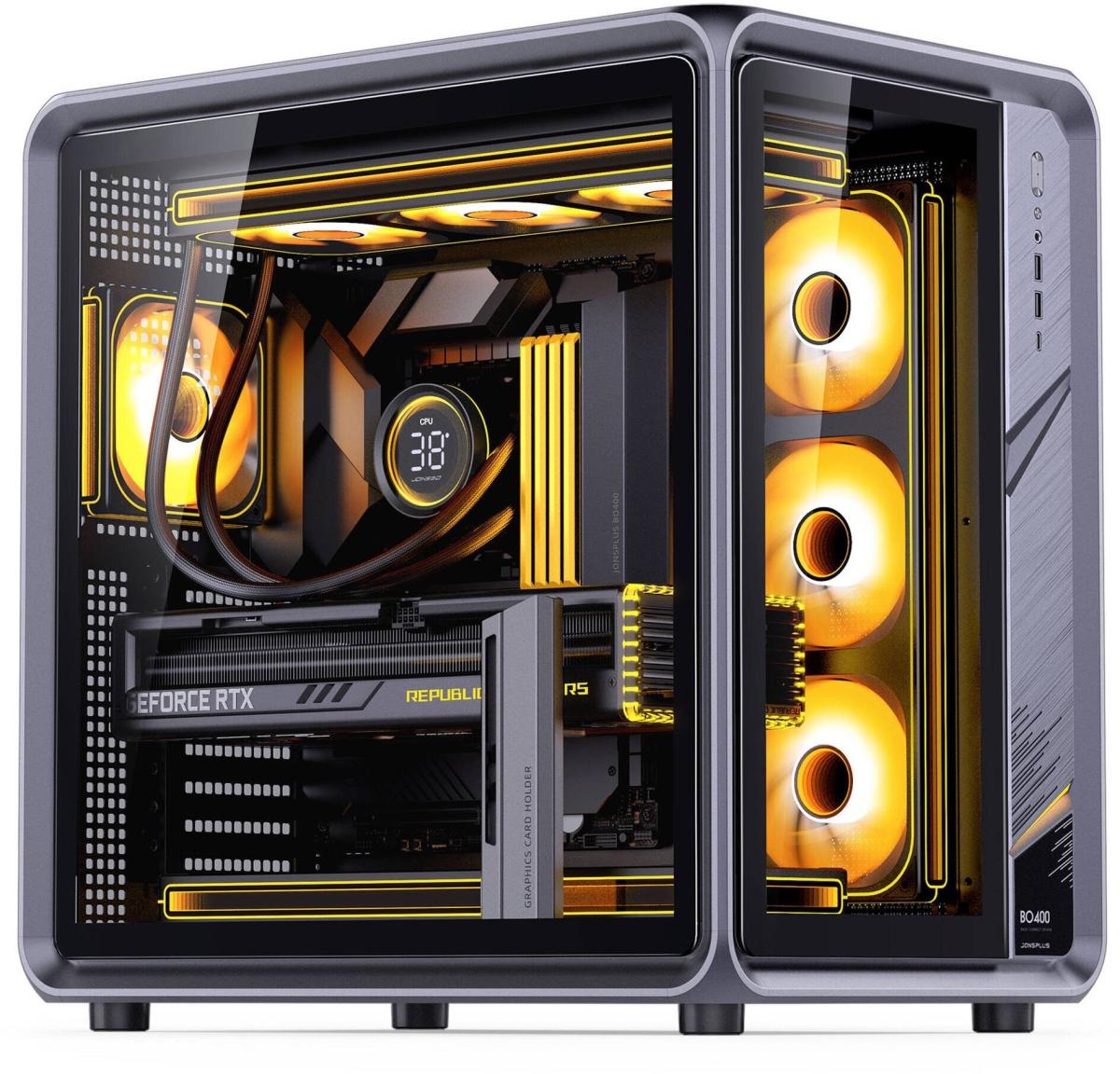The Jonsplus BO400 is an innovative showcase case that impresses with its modular architecture, high-quality materials, and clever cooling. With a focus on flexibility and aesthetics, it offers everything enthusiasts and modders need for a customized setup. Showcase case: Midi-tower with sturdy aluminum frame Interchangeable top cover: Choice between metal and glass cover Tool-free removal of individual panels: All sides can be removed without tools 24-pin cable cover: Adjustable cover hides the 24-pin cable Flexible GPU bracket: For various graphics card lengths Jonsplus BO400: Midi-tower with panorama design Jonsplus BO400 with example hardware Show off your setup with the Jonsplus BO400: The midi-tower impresses with extensive cooling options, modular covers, and room for high-end hardware. Flexible panorama design By default, the case comes with a robust metal cover on the top—which can easily be replaced with the included glass panel. The front can also optionally be fitted with a metal panel. The choice is yours: Go for a subtle look with metal elements, or opt for an impressive glass panorama—on two or three sides. Either way, your hardware will be showcased strikingly! Tidy cable management for a clean look from every angle The Jonsplus BO400 case supports motherboards with back-connect design—all ports are hidden on the rear. This way, there are no disruptive cables covering your gaming hardware. Additionally, the tower includes a built-in cover that hides and secures the large 24-pin cable. High-quality aluminum frame The frame is made of aluminum—for a stable and robust structure that also improves airflow thanks to better heat dissipation and gives the case a premium design. Room for powerful high-end hardware Motherboards with Mini-ITX, mATX, and ATX form factor Graphics cards up to 435 mm in length CPU coolers up to 173 mm in height Power supply units up to 200 mm Up to two 3.5-inch SSDs and four 3.5-inch HDDs I/O Panel: 2x USB 3.0, 1x USB-C 3.1, 1x 3.5 mm audio jack Jonsplus BO400 The midi-tower thus offers plenty of space for high-end hardware and is suitable for enthusiasts looking to build a new gaming PC, as well as for beginners assembling their first own PC. Powerful cooling in any situation Jonsplus BO400 fans and radiators To stay cool even under full load, the Jonsplus BO400 supports the installation of up to ten 120 mm fans. You can also install up to three AiO water cooling systems with sizes of 280 mm or 360 mm, allowing you to freely choose between air or water cooling for your CPU. Case includes adjustable mounts for fans and graphics cards Jonsplus BO400 Thanks to the adjustable GPU bracket, your high-performance graphics card stays secure. The bracket can be flexibly adjusted in both length and height to fit different graphics card models. The lower fans can be installed in two different positions. The slightly higher position is especially advantageous for fans with side LED effects, as the lighting is showcased better in this setup.