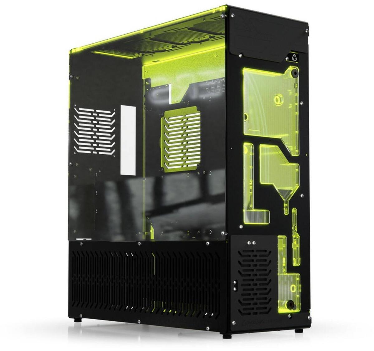 Showcase-Gehäuse für WaKü-Enthusiasten, für Mini-ITX/DTX-Mainboards, mit integrierter Distroplate aus Acryl, vertikale Installation von GPUs bis 300 mm, für 240 mm x 30 mm Radiatoren, 13x 2,5-Zoll- und 1x 3,5-Zoll-Festplatten, Seitenwände aus Aluminium