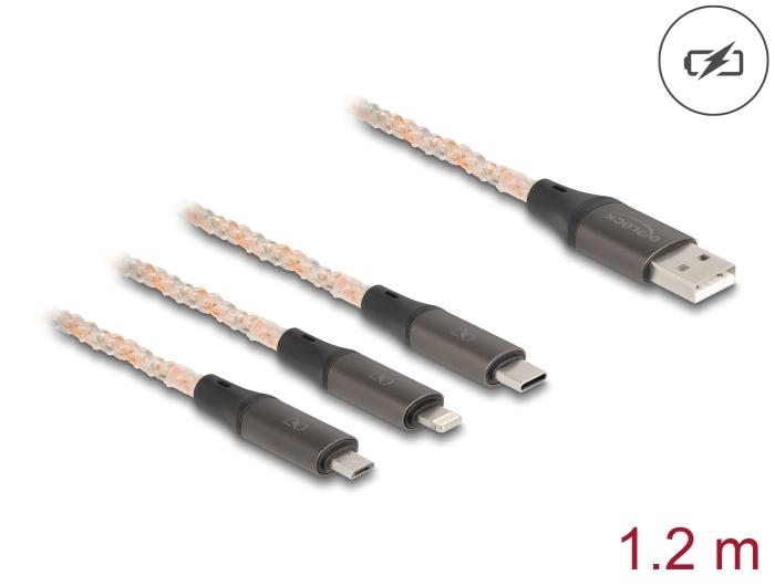 Seda Delocki 3 in 1 laadimiskaablit saab kasutada erinevate seadmete, nt Lightning™-, Micro USB-B- või USB Type-C™-liidesega tahvelarvutite või nutitelefonide laadimiseks USB-toiteallika kaudu.Kasulik kaaslaneSee kaabel on ideaalne kaaslane teel olles nt ärireisidel või puhkusel, sest see ühendab kolm kõige levinumat liidest ühte kaablisse uusimate mobiilseadmete jaoks. Nii välditakse tüütut kaablisegadust ja lugematute kaablite asjatut kaasas kandmist.RGB-valgustusNiipea, kui kaabel on ühendatud vooluallikaga, süttib see punaselt ja muutub seejärel pehmeks värvigradientiks, milles on seitse erinevat värvi. Valgustus on alati diskreetne ja märkamatu.Tehnilised üksikasjadÜhendused:1 x USB 2.0 Type-A isane ühendus: 1 x USB 2.0 Type-A isane1 x 8-poolne Apple Lightning™-istmik1 x USB Type Micro-B pesa1 x USB Type-C™ pesaToetab ainult laadimisfunktsiooniRGB-valgustus: sujuv värvigradient 7 erinevas toonisMaksimaalne väljundvool:USB Type Micro-B / Lightning™: 2,4 AUSB Type-C™: 3 APinge: max. 5 VKaabli läbimõõt: 22 AWGLäbipaistva nailonvarjestusega kaabelMetallist korpusega pistikupesaVärv: läbipaistev/vaskvärvilinePikkus koos pistikutega: ca 1,20 m.SüsteeminõudedToiteallikas, millel on vaba USB tüüp A portPakendi sisuKaabel