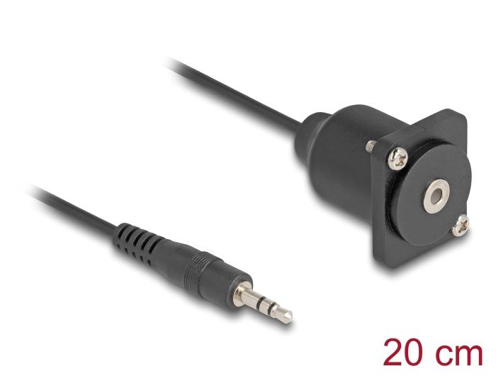 Seda Delocki kaablit saab kasutada näiteks D-tüüpi avaga paneelidesse või korpusesse paigaldamiseks ja seda saab kasutada erinevate 3,5 mm audioliitmikuga seadmete ühendamiseks.Eriomadused- Sisemise metallniidigaSpetsifikatsioonLiitmikud:1 x 3,5 mm 3-poolne stereoklappide pistikupesa.1 x 3,5 mm 3-poldiline stereopesa (emane)D-tüüpi pordid 24 x 19 mm jaoksPaneeli väljalõige (läbimõõt): ca. 24 mmKaks kinnitusauku kruvikinnituseksKaabli läbimõõt: ca. 2,8 mmPikkus koos pistikutega: ca. 20 cmMaterjal: PVCVärv: mustSüsteeminõudedVaba 3,5 mm 3-pooluseline stereoklappide pistikupesaVaba stereopesa 3,5 mm 3-poldiline pesa.Pakendi sisuD-tüüpi kaabel