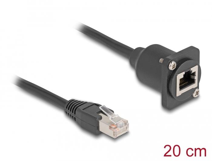 This cable by Delock can be used e.g. for installation in a panel or housing with D-Type opening. It can also be used to extend and connect various network devices.SpecificationConnectors:1 x RJ45 jack1 x RJ45 jackCat.5e specificationShielded (STP)Cable gauge: 24 AWGFor D-type ports with 24 x 19 mmPanel cut-out (diameter): ca. 24 mmTwo mounting holes for screw fasteningCable diameter: ca. 6 mmLength incl. connectors: ca. 20 cmMaterial: PVCColour: blackSystem requirementsA free RJ45 portPackage contentD-Type cable