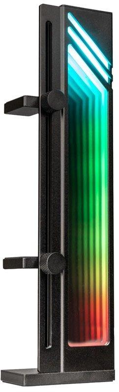 GPU support, ARGB lighting with infinity mirror effect, made of aluminum, height adjustable, supports up to two GPUs, designed for heavy graphics cards