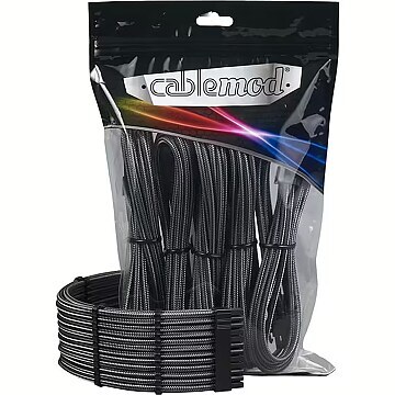 Cable kit with 12VHPWR cable, for power supplies with universal connectors, textile sleeving made from ModMesh, includes cable combs and shroud, includes cables for motherboards.