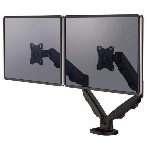 Eppa™ Dual Monitor Arm - Black - Eppa™ offers effortless gas spring finger touch adjustment, perfect for hot desking and collaborative working. - Minimalistic and stylish design with built-in cable management to keep you tangle free. - Achieve the perfect position and comfort with 26cm of height adjustability and 53cm of reach. - Holds 30” (76.2cm) monitors weighing up to 8kg each. - Desk clamp and grommet mount included for secure and easy attachment options. - Tested by FIRA International Ltd to comply with the ergonomic requirements set out in European Health and Safety Legislation: EN ISO 9241-5