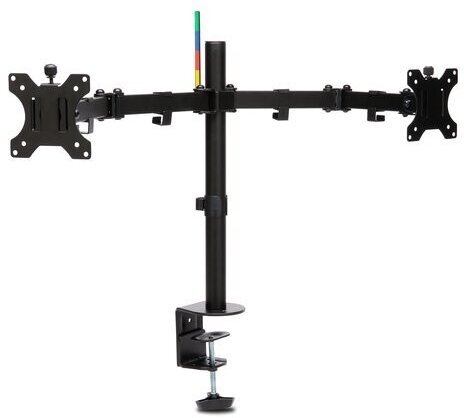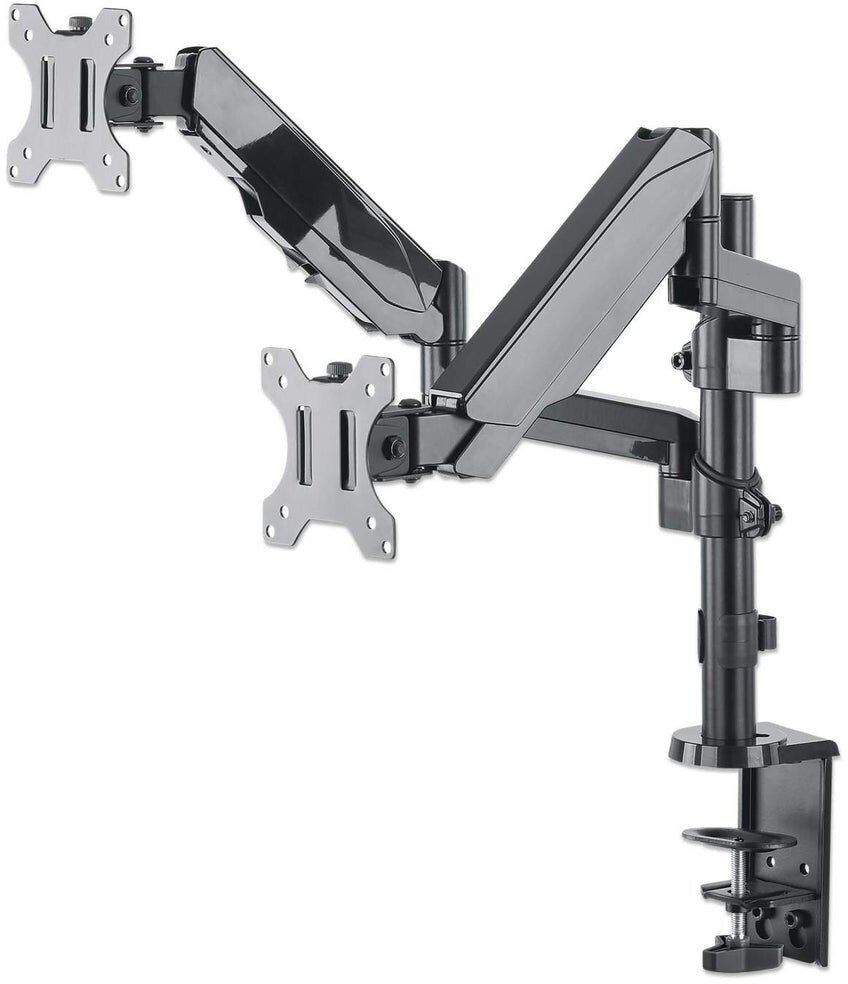 The Manhattan Universal Gas Spring Dual Monitor Mount securely supports two 17" to 32" TVs or monitors. Because it uses gas springs to hold your displays, the arms only need the lightest touch to move them to the best viewing angles for your purposes. The mount's high-quality aluminum and steel construction will provide years of reliable service. Ideal for installation on a large desk, the Manhattan Universal Gas Spring Dual Monitor Mount lets you take advantage of the extra range of movement so you can have more space to get work done.