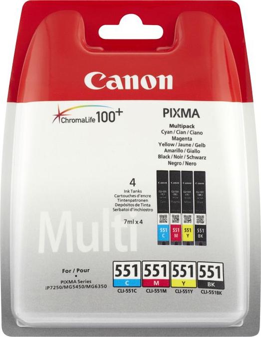 Ink Cartridges CLI-551 Photo Value Pack C/M/Y/BK incl. PP-201 Photo PaperColours: cyan, magenta, yellow and blackContent: 4x7 mlCanon's Photo Paper is the perfect photo paper for superior quality output with a glossy finish. It provides the perfect finish for digital photographs and all your reprints. Printing Ink 4-Colours (BK/C/M/Y) Content Cartridges 4x 7 Number of Cartridges 4