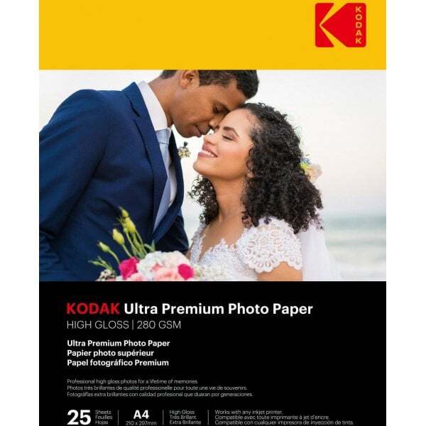 Kodak Ultra Premium is a studio-quality photo paper that dries immediately after exiting the printer and does not smudge. Photo paper works with all inkjet printers. A4 format photo paper Studio quality result Glossy surface, dries instantly Gram weight: 280 g/m² 25 sheets