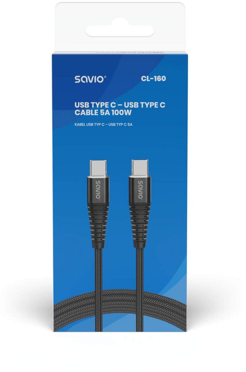 USB Type C USB Type C Cable 5A 2m SAVIO CL-160 Functionality: Fast data transmission Charging (support for Quick Charge and Power Delivery) Application example: Connection of tablet, smartphone or navigation to a charger, computer for charging or data transfer, charging of notebooks equipped with USB type C plug