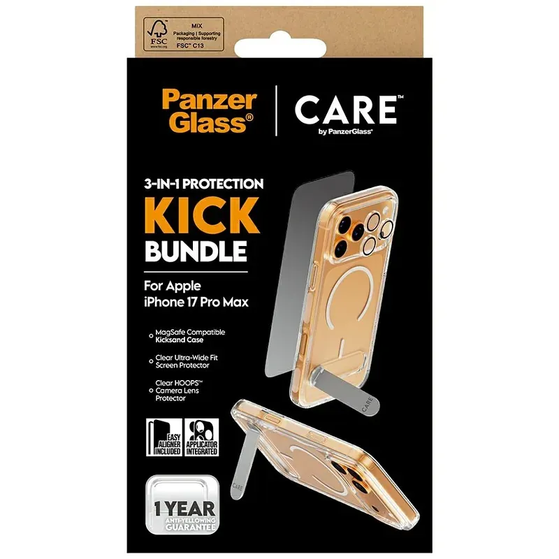 • Selge ekraanikaitse Apple • Läbipaistev Karastatud klaas, Polüetüleentereftalaat (PET), Silikoon • Kriimukindel, Löögikindel • Kumerad servad • Kuiv pealekandmine Näpujälgede vastane kaitse • 1 tk PanzerGlass ® | CARE by ® 3-in-1 Feature Kick Bundle iPhone 17 Pro Max, Apple, Apple - iPhone 17 Pro Max, Kuiv pealekandmine, Kriimukindel, Löögikindel, Läbipaistev, 1 tk
