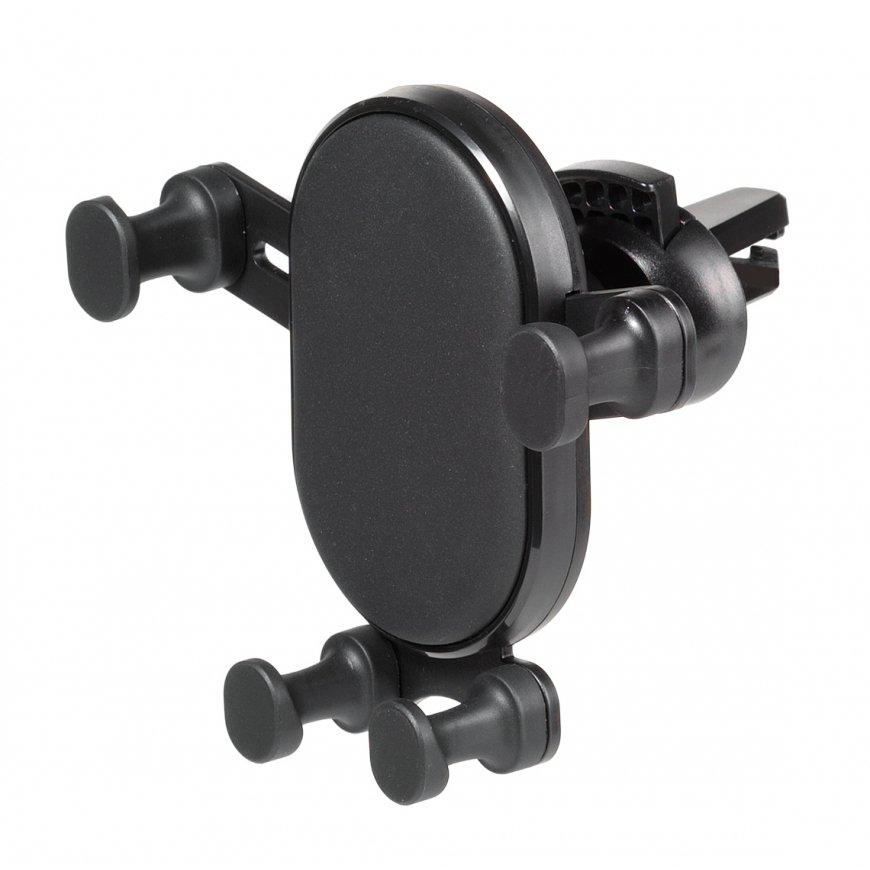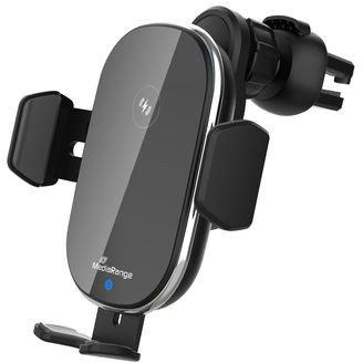 MediaRange 15W wireless air vent car charger, with automatic brackets, black. MediaRange inductive charging stations for car air vents are ideal for wireless charging of suitable mobile devices in your car. The smartphone is simply placed on the charging station and the charging process starts automatically after the automatic closing mechanism has enclosed your device securely and stable. The charging station is connected via a bus-powered USB port in your car or an external USB charger. This charging station supports fast charging and provides a maximum output power of 15W when used with an appropriate fast charger. inductive fast charging* station for wireless charging of Qi enabled smartphones touch sensor for opening and closing brackets automatically and LED indicator light. input power via USB Type-C® port: DC 5.0V - 2.0A or 9.0V - 2.0A; (18.0W max.) via additional fast charger (Not included.) output power: 5.0W, 7.5W, 10.0W or 15.0W max. charges smartphones in plastic covers overvoltage protection, overcharge protection, overheat protection, short circuit fuse, foreign object detection, fast charge function and LED indicator light fast charge function is supported by appropriated fast charge devices only and the charging pad need to be connected to a separate fast charge power supply.